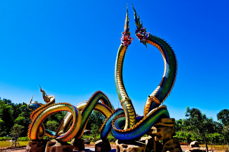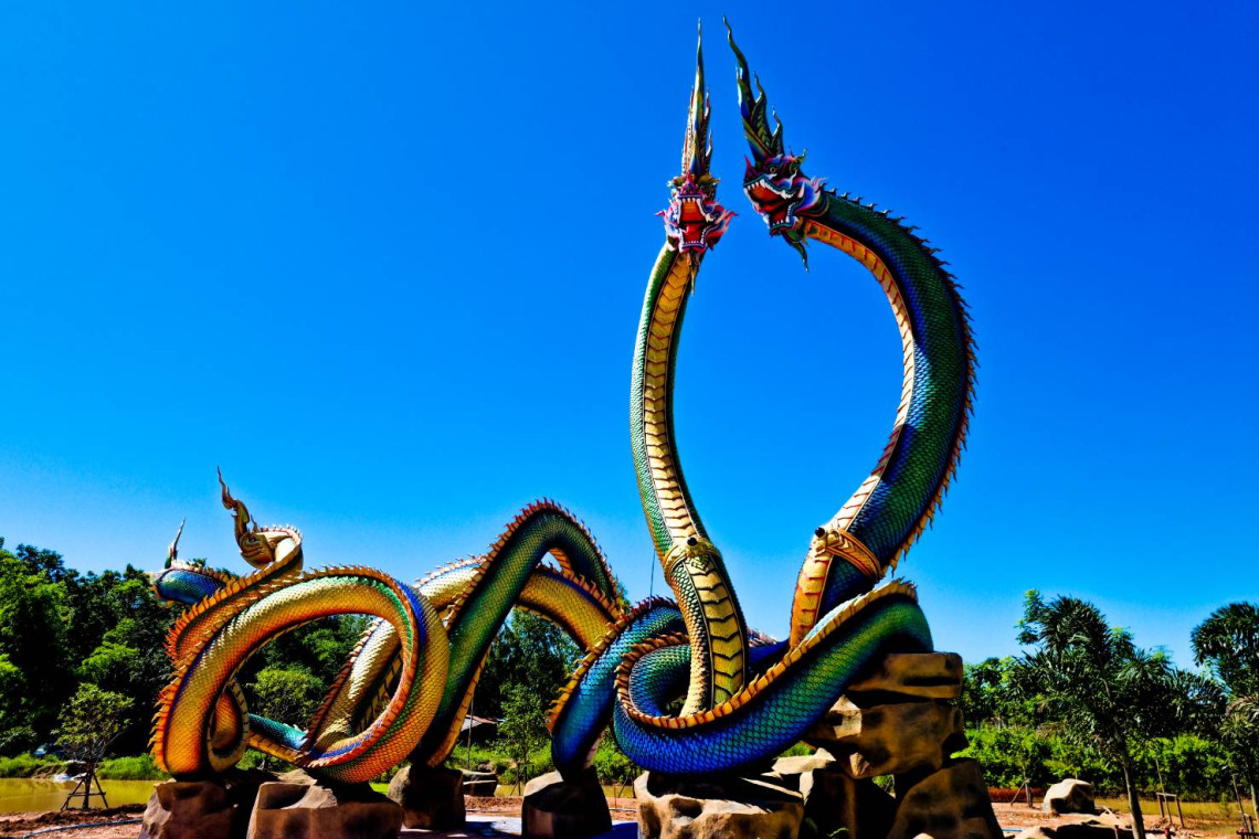 สายมูห้ามพลาด แลนด์มาร์คพญานาคคู่ หวังจุดดึงดูดนักท่องเที่ยวแห่งใหม่ของเมืองอุดรหลังโควิดซาแล้วเจอกัน พิกัด บ้านดอนสวรรค์ หมู่ 9 ตำบลเพ็ญ ถนนเพ็ญ - สินเจริญ อำเภอเพ็ญ จังหวัดอุดรธานี วันนี้ (19 มิ.ย.64) ผู้สื่อข่าวรายงานว่า นายฤกษ์พิเชษฐ์ แก่นดี น้องชายน.ส.น้อย ภูพรหมมี เจ้าของความคิดสร้างแลนด์มาร์ค ประกายแก้ววังนาคิน เปิดเผยว่า เดิมทางบ้านประกอบอาชีพค้าขายวัสดุก่อสร้าง ก่อนจะมาเป็นแลนด์มาร์คพญานาค พี่สาวมีความเชื่อและศรัทธาในพญานาคมานาน เคยไปขอพรกับพ่อปู่ศรีสุทโธและแม่ย่าศรีปทุมมาที่คำชะโนดมาก็หลายครั้ง พร้อมขอว่าหากประสบความสำเร็จด้านการงานอาชีพ เมื่ออายุ 50 ปี จะสร้างรูปปั้นให้ พออายุ 50 ปี ตอนแรกก็ไม่คิดจะสร้างรูปปั้นที่นี่ ตั้งใจจะไปสร้างที่วัด จากนั้น พี่สาวก็ฝันว่ามีพญานาค 7 ตน มาเล่นน้ำที่บ่อน้ำซึ่งเดิมคิดว่าจะทำเป็นบ่อตกปลา ต่อมาตนเองและพี่สาวขับรถท่องเที่ยวหาดูรูปปั้นพญานาคหลายที่แต่ก็ไม่ถูกใจ พอไปดูที่ภูมโนรมย์ จ.มุกดาหาร เห็นแล้วชื่นชอบสวยงามถูกใจ จึงประสานงานติดต่อหาช่างที่สร้างให้ไปสร้างรูปปั้นที่อุดรธานี โดยออกแบบตามความฝัน “พี่สาวบอกช่างว่าอยากได้พญานาคคล้ายคนทำมือรูปหัวใจแบบเกาหลี” ทั้งนี้ ก่อนสร้างมีเรื่องแปลกเกิดขึ้น คือ คันดินด้านหนึ่งพัง น้ำที่มีจำนวนมากก็ไหลออก เมื่อช่างมาถึงช่วงสายพบว่า กลางบ่อน้ำมีสันดอนแล้วล้อมรอบด้วยน้ำ ช่างจึงว่าเลือกจุดนี้ เหมาะ กับการสร้างพญานาค สำหรับประติมากรรมพญานาคคู่ประกายแก้ววังนาคินทร์ พิกัดตั้งอยู่ที่บ้านดอนสวรรค์ หมู่ 9 ตำบลเพ็ญ ถนนเพ็ญ - สินเจริญ อำเภอเพ็ญ จังหวัดอุดรธานี โดยรูปปั้นพญานาคมีความสูงราว 16.40 เมตร ยาว 70.70 เมตร เส้นผ่าศูนย์กลางประมาณ 1.20 เมตร งบประมาณก่อสร้างทั้งสิ้น 3 ล้านบาท รูปปั้นปู่ศรีสุทโธมีสีเขียว ส่วนย่าศรีปทุมมาสีทอง ใช้เวลาก่อสร้าง 9 เดือน ตั้งแต่เดือนตุลาคม 2563 ถึง มิถุนายน 2564 พื้นที่นี้มีทั้งหมด 70 ไร่ แบ่งพื้นที่ใช้สอยทำเป็นแลนด์มาร์ค 15 ไร่ ประกอบด้วย ร้านกาแฟ ลานจอดรถ และสร้างแลนด์มาร์ครูปปั้น หลังเปิดให้ประชาชนและนักท่องเที่ยวเข้าชมแต่ยังไม่เยอะเพราะเจอวิกฤติโควิด 19 ก็พอมีคนมากราบไหว้ขอพรตามความเชื่อก็ประสบความสำเร็จ บางคนโชคดีถูกหวย ซึ่งเท่าที่รู้องค์ปู่ย่าให้โชคคนแถวนี้แล้ว 3 งวด อนาคตวางแผนว่าด้านหน้าจะมีลานจอดรถ มีสวนหย่อม ด้านหลังจะปลูกข้าว ทำสวนดอกไม้ และมุมถ่ายรูป เพื่อให้นักท่องเที่ยวแวะพักผ่อนและทำให้แลนมาร์คจุดนี้สวยงามยิ่งขึ้น โดยชาวบ้านแถวนี้ส่วนใหญ่เห็นดีด้วย เพราะจะทำให้