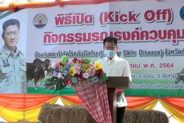 ในพื้นที่ จ.ชัยภูมิ มีการเลี้ยงวัว ควายทุกประเภท มากเป็นอันดับ 6 ของภาคอีสาน มากกว่า 1 แสน 2 หมื่นตัว มีวัวตายจากโรคลัมปีสกินแล้ว 66 ตัว ยังไม่ได้รับวัคซีนที่ได้มาตรฐานและมีคุณภาพจากกรมปศุสัตว์มาฉีดป้องกันโรคให้กับวัว ควายที่เลี้ยงไว้อย่างเพียงพอ เร่งใช้ ภูมิปัญญาชาวบ้านสมุนไพรไล่แมลง พาหะนำเชื้อไม่ให้มากัดวัว ควายที่เลี้ยงไว้ ช่วยลดจำนวนป่วย ตายให้เร็วที่สุด วันนี้(24มิ.ย.2464)​ ที่ วัดโคกสว่าง บ้านห้วยบง ต.ห้วยบง อ.เมือง จ.ชัยภูมิ นายวิเชียร จันทรโณทัย ผู้ว่าราชการจังหวัดชัยภูมิ เป็นประธานจัดงานรณรงค์ควบคุม ป้องกันและกำจัดโรคลัมปีสกิน (Lumpy Skin Disease) หลังจากในขณะนี้ โรคลัมปีสกิน ประเทศไทยพบมีการแพร่ระบาดใน 56 จังหวัด รวมทั้งจังหวัดชัยภูมิ พบมีการแพร่ระบาดของโรคลัมปีสกินทั้ง 16 อำเภอจังหวัดชัยภูมิ ล่าสุดเมื่อวันที่ 23 มิถุนายน 2564 มีเกษตรกรได้รับความเดือดร้อนจากวัวตาย 1,120 ราย มีวัวป่วยสะสมทั้งหมด 2,229 ตัว วัวตายสะสมแล้ว 66 ตัว มากที่สุดในพื้นที่อำเภอเมืองชัยภูมิ สาเหตุที่ทำให้โรคมีการแพร่ระบาดไปอย่างรวดเร็ว คือการเคลื่อนย้ายโค กระบือ มีชีวิตจากพื้นที่ที่มีการระบาดของโรคไปยังพื้นที่ต่าง ๆ การฉีดวัคซีนป้องกันโรคลัมปีสกินที่ไม่ได้มีการตรวจสอบคุณภาพจากองค์การอาหารและยา และการแพร่ขยายพันธุ์ของแมลงดูดเลือดอย่างชุกชุมในช่วงฤดูฝน ซึ่งขณะนี้ จ.ชัยภูมิ ยังไม่ได้รับการจัดสรรควัคซีนที่ได้คุณภาพและได้มาตรฐานจากกรมปศุสัตว์ ทำให้แนวโน้มการเกิดโรคลัมปีสกิน ในจังหวัดชัยภูมิมีแนวโน้มเพิ่มสูงขึ้นอย่างรวดเร็ว การป้องกันไม่ให้วัว ควายที่เลี้ยงไว้ไม่ให้ป่วยด้วยโรคลัมปีสกิน คือกำจัดแมลงดูดเลือดที่เป็นพาหะนำโรคที่สำคัญ ไม่ว่าจะเป็นยุงลาย แมลงวันคอก เห็บ และเหลือบ ภายในงาน มีทั้งการให้ความรู้เกษตรกรผู้เลี้ยงวัว และควาย พร้อมทั้งสาธิตการใช้สมุนไพรในการไล่แมลง การมอบเวชภัณฑ์ในการกำจัดแมลง พร้อมทั้งมีการจัดรถ Mobile ออกฉีดพ่นยากำจัดแมลงและฆ่าเชื้อโรคในฟาร์มเลี้ยงสัตว์ของเกษตรกร นายวิเชียร จันทรโณทัย ผู้ว่าราชการจังหวัดชัยภูมิกล่าวว่าการใช้วัคซีนควบคุมโรคลัมปีสกิน ซึ่งเป็นโรคอุบัติใหม่ที่เกิดในประเทศไทย มีความจำเป็นต้องใช้อย่างระมัดระวัง และติดตามผลหลังการใช้อย่างใกล้ชิด ซึ่งในพื้นที่ จ.ชัยภูมิ ยังไม่ได้รับการจัดสรรควัคซีนป้องกันโรคลัมปีสกินจากกรมปศุสัตว์ แต่พบว่ามีเกษตรกรผู้เลี้ยงวัว หาซื้อวัคซีนป้องกันโรคคลัมปีสกินเอง ซึ่งนับว่าเสี่ยงที่อาจทำให้วัว ควายที่ฉีดวัคซีนจะมีผลข้างเคียงถึงตายได้ การ