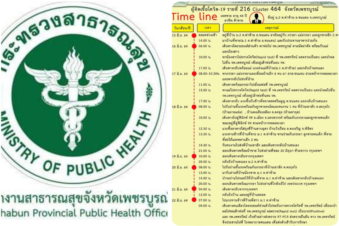 เพจเฟสบุ๊คสำนักงานสาธารณสุขจังหวัดเพชรบูรณ์ ได้โพสต์ข้อความศูนย์ปฏิบัติการ COVID-19 จังหวัดเพชรบูรณ์ โดย สำนักงานสาธารณสุขจังหวัดเพชรบูรณ์เเจ้ง timeline ผู้ป่วย ยืนยัน จำนวน 9 ราย ในวันที่ 24 มิถุนายน 2564 (รายที่ 216-224)ว่า