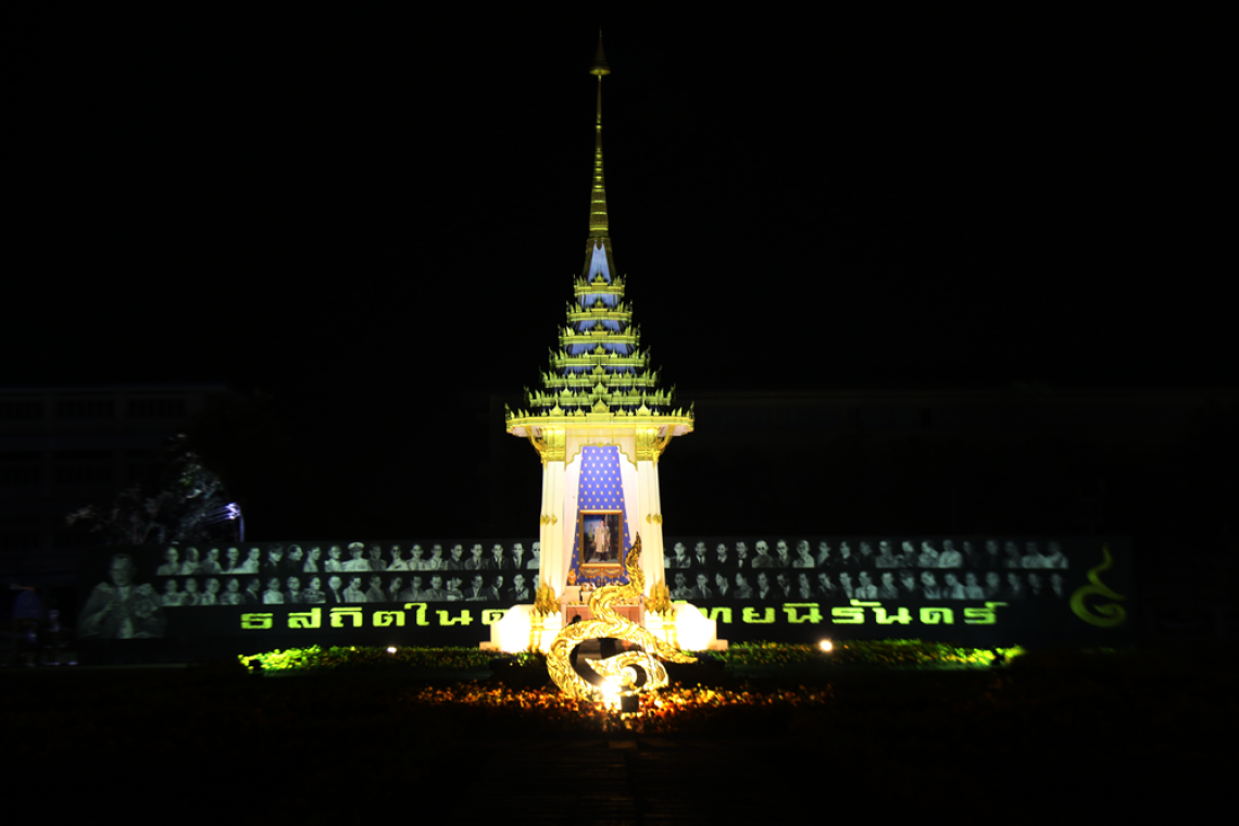 ฉากหลังพระเมรุมาศจำลอง จ.เลย ปรากฏคำ "ธ สถิตในดวงใจไทยนิรันดร์" สีทองอร่ามสมพระเกียรติ