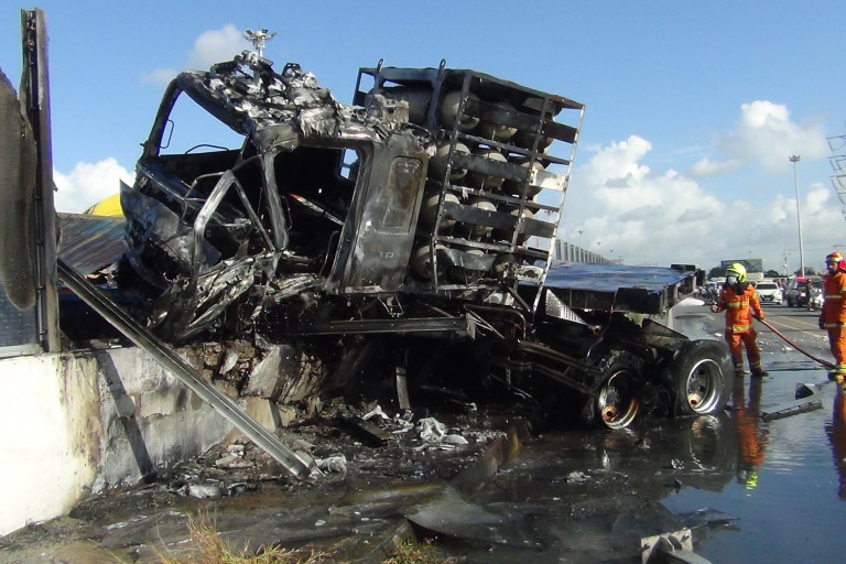 ยักษ์ขยี้ยักษ์ ทำไฟลุกท่วมมอเตอร์เวย์แต่เช้าตรู่ ทำคนขับเจ็บ 2 รายโชคดีที่ไม่มีใครเสียชีวิต ขณะแนวรั้วคอนกรีตพร้อมกำแพงกระจกกั้นเสียงทางด่วนพังเสียหายยับยาวถึงกว่า 40 เมตร ทำผู้คนสัญจรใช้เส้นทางขาออกมุ่งหน้า จ.ชลบุรี ชะลอตัวจากการสูญเสียช่องจราจรไป 2 ช่องทาง ด้านตำรวจยังไม่ชี้สาเหตุหลังคนขับทั้งคู่ถูกนำส่งไปยังโรงพยาบาล