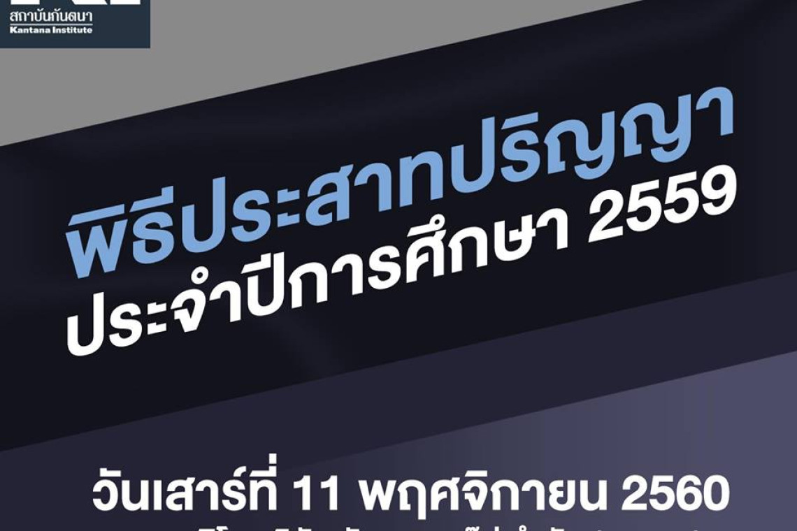 สถาบันกันตนา เตรียมจัดพิธีประสาทปริญญาบัตร ร่วมแสดงความยินดีกับมหาบัณฑิตกิตติมศักดิ์ บัณฑิตปริญญาโท รุ่น 3 หลักสูตรศิลปกรรมศาสตรมหาบัณฑิต สาขาวิชาการจัดการสื่อบันเทิง และบัณฑิตปริญญาตรี รุ่น 4 หลักสูตรศิลปกรรมศาสตรบัณฑิต สาขาการผลิตภาพยนตร์, สาขาการผลิตแอนิเมชัน และสาขาการผลิตรายการโทรทัศน์เพื่อการสื่อสารข้ามสื่อ ประจำปีการศึกษา 2559 โดยมี ดร.สุเมธ ตันติเวชกุล เลขาธิการมูลนิธิชัยพัฒนา เป็นประธานในพิธี ในวันเสาร์ที่ 11 พฤศจิกายน 2560 เวลา 13.30-15.30 น. ณ สตูดิโอ บริษัท กันตนา กรุ๊ป จำกัด (มหาชน) สอบถามรายละเอียดเพิ่มเติมได้ที่ www.kantana.ac.th หรือโทร.034-964441-3 และ 098-556-4151 หรือ Line ID : Kantanainstitute และ Facebook : Kantana Institute