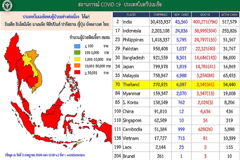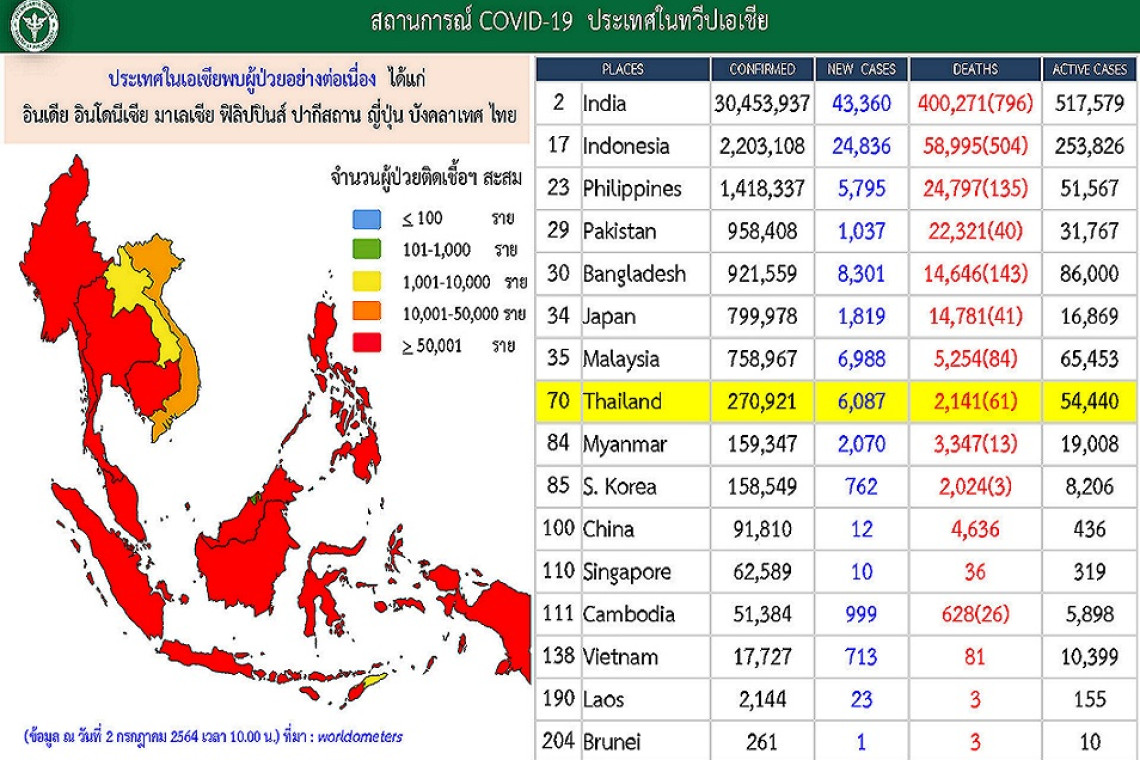 ศูนย์ข้อมูลโควิด-19 รายงานสถานการณ์การติดเชื้อไวรัสโควิด-19 ในทวีปเอเชีย โดยเฉพาะในกลุ่มประเทศอาเซียน 10 ประเทศ พบว่าข้อมูลวันที่ 2 ก.ค.64 ประเทศไทยอันดับเลื่อนขึ้นอีก โดยอยู่ในอันดับที่ 70 ของโลก จากเมื่อวานอันดับ 72 และเป็นลำดับที่ 4 ในกลุ่มประเทศอาเซียน