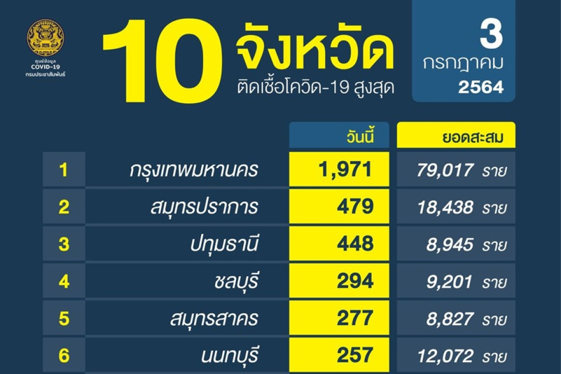ขณะที่ 10 อันดับจังหวัดที่พบผู้ติดเชื้อรายใหม่สูงสุด อันดับ 1 ยังคงเป็นกทม.ที่ 1,971 ราย แม้จะลดลงจากเมื่อวานนี้ที่ทำสถิติสูงที่สุดเกิน 2 พันราย แต่ยังอยู่ในจำนวนที่สูงมาก และยอดรวมผู้ป่วยสะสมอยู่ที่ 79,017 ราย ขณะที่พบว่าจังหวัดปทุมธานี วันนี้ตัวเลขรายใหม่เพิ่มขึ้นมากเป็นอันดับ 3 โดยพบว่าใน 10 อันดับ มีกทม.และปริมณฑลรวม 6 จังหวัด ตามด้วยจังหวัดในภาคใต้ 3 จังหวัด และจังหวัดในภาคตะวันออก 1 จังหวัด