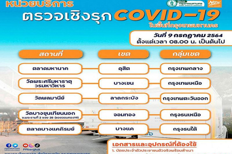 กรุงเทพมหานคร แจ้งออกหน่วยบริการตรวจเชิงรุก COVID-19 ในพื้นที่กทม. วันที่ 9 ก.ค. 64 ตั้งแต่เวลา 08.00 น. เป็นต้นไป ดังนี้