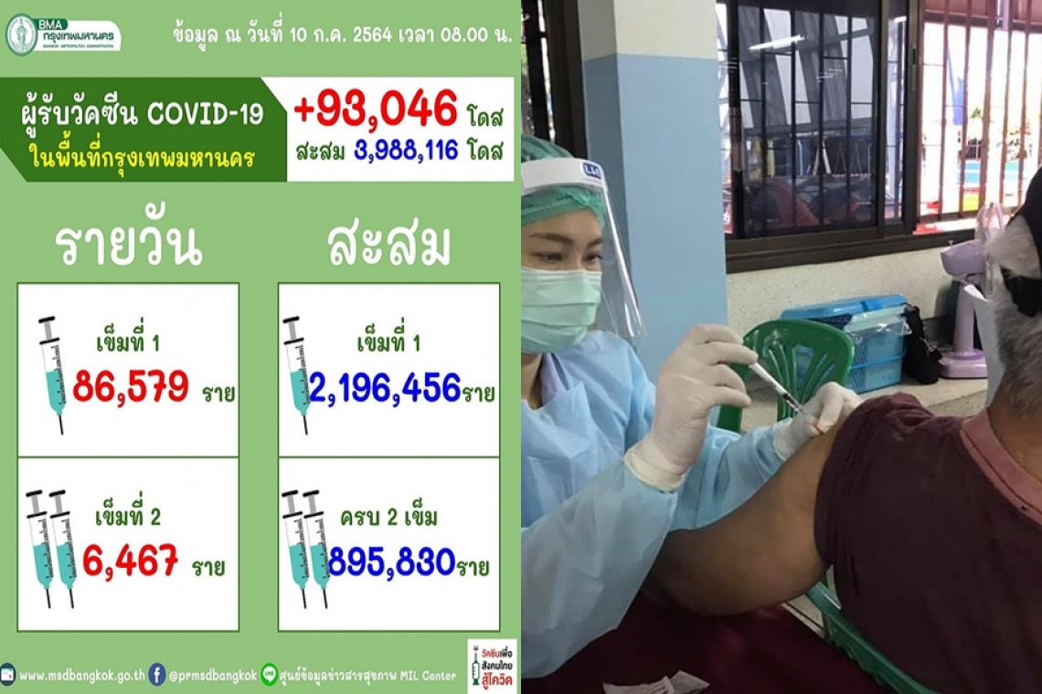กรุงเทพมหานคร รายงานผลการดำเนินการให้บริการวัคซีน COVID-19 ในพื้นที่กรุงเทพมหานคร ข้อมูล ณ วันที่ 10 ก.ค.64 เวลา 08.00 น. ยอดผู้รับวัคซีนเพิ่ม 93,046 โดส ยอดผู้รับวัคซีนสะสม 3,988,116 โดส