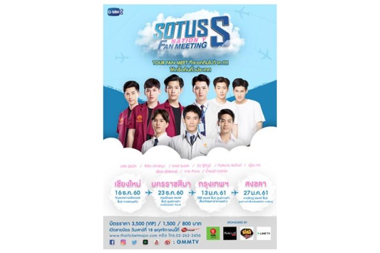 “จีเอ็มเอ็มทีวี” เจ้าแห่งซีรี่ส์วัยรุ่น ผู้ผลิตซีรี่ส์สุดฮอต “SOTUS S THE SERIES” ภาคต่อ “SOTUS THE SERIES พี่ว้ากตัวร้ายกับนายปีหนึ่ง” ที่ได้รับความสำเร็จอย่างท่วมท้น โดยเฉพาะคู่จิ้นสุดปัง “คริส พีรวัส-สิงโต ปราชญา” รวมถึงทั้งนักแสดงรุ่นพี่รุ่นน้องกลายเป็นที่รู้จักและมีแฟนคลับล้นหลาม ล่าสุดจัดงาน “SOTUS S NATION Y FAN MEETING” TOUR FAN MEET ส่ง “คริส-สิงโต” พร้อมด้วย “ออฟ จุมพล, นิว ฐิติภูมิ, กันสมาย ชนกันต์, อู๋จุน กร, เฟียต พัทธดนย์, กาย ศิวกร, น้ำมนต์ กฤตนัย” ยกทีมไปว้ากให้กรี๊ดกันทั่วประเทศ เริ่มที่ เชียงใหม่ 16 ธันวาคม 60 / นครราชสีมา 23 ธันวาคม 60 / กรุงเทพฯ 13 มกราคม 61 และ สงขลา 27 มกราคม 61 “คริส-สิงโต” ตัวแทนเผยว่า “รู้สึกตื่นเต้นมากๆ ครับ สำหรับ TOUR FAN MEET “SOTUS S NATION Y FAN MEETING” ที่พวกเรา 9 คนจาก “SOTUS S THE SERIES” จะยกทีมไปว้ากแฟนๆ ทั่วประเทศ ก็อยากชวนแฟนๆ มาร่วมสนุกกันเยอะๆ รับรองว่าเราจะว้ากกันให้สุดๆ ไปเลย นอกจากนี้เรายังเตรียมโชว์พิเศษ เกมส์ฟินๆ และเซอร์ไพร์สไว้รอทุกคนอีกด้วย ซึ่งจะเปิดจำหน่ายบัตร Pre-Sale ในวันที่ 17 พฤศจิกายนนี้ เวลา 14.00 น. ที่ Show DC พิเศษสุดๆ คือจะได้รับบัตรจากพวกเรา 9 คนเองด้วย แล้วเจอกันนะครับ” เปิดจำหน่ายบัตร Public Sale วันที่ 18 พฤศจิกายนนี้ เริ่มเวลา 10.00 น. เป็นต้นไป บัตรราคา 3,500 (VIP) / 1,500 / 800 บาท ซื้อบัตรได้ที่ ไทยทิคเก็ตเมเจอร์ ทุกสาขา, www.thaiticketmajor.com และ Call center โทร 0-2262-3456 ติดตามรายละเอียดเพิ่มเติม : Facebook / Instagram / Twitter / LINE TV / YouTube / Weibo : GMMTV