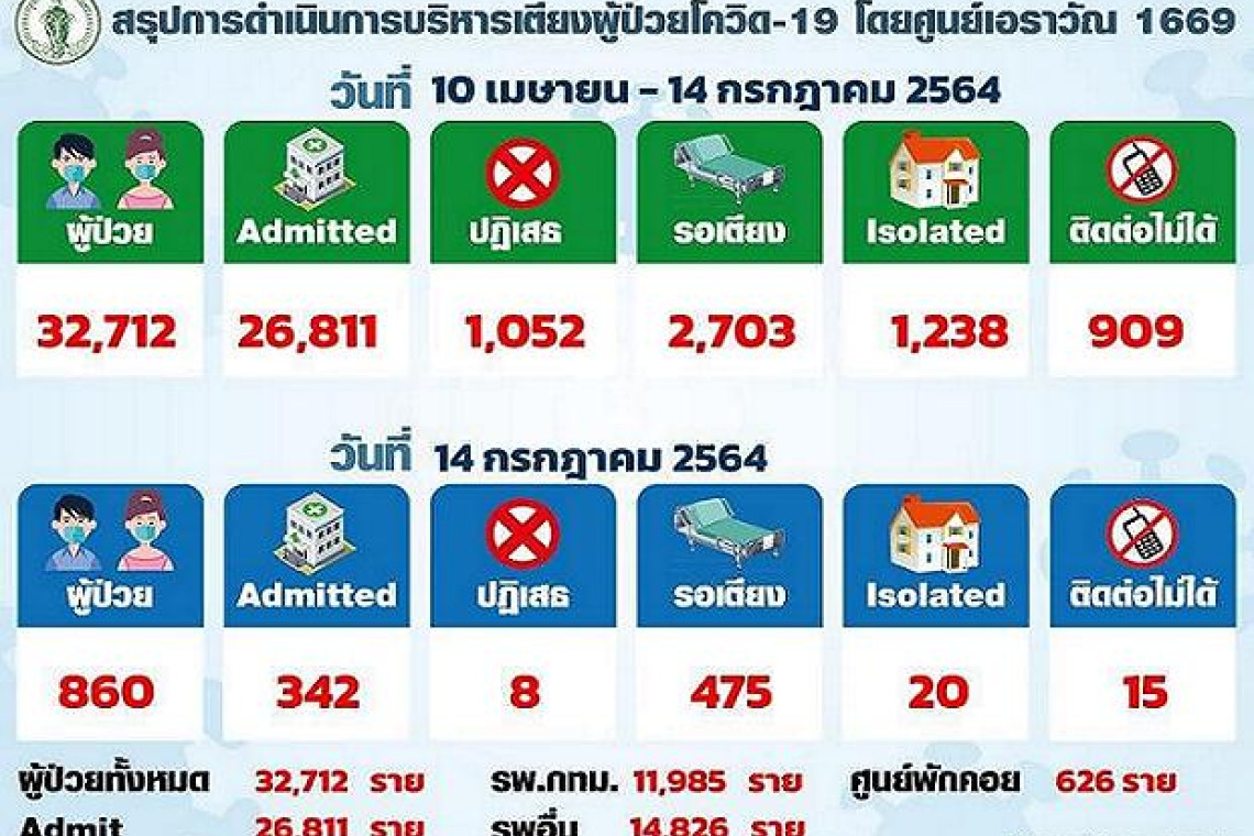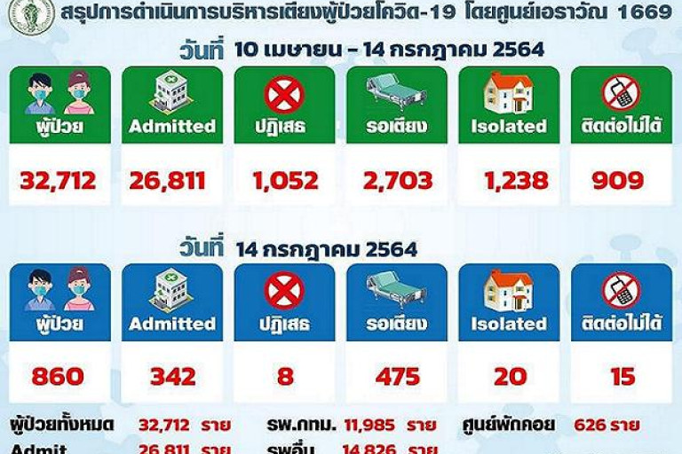 กรุงเทพมหานคร แจ้ง ศูนย์เอราวัณ สำนักการแพทย์ กทม. รายงานสถานการณ์การบริหารจัดการเตียง ประจำวันที่ 14 กรกฎาคม 2564?โดยศูนย์เอราวัณ บูรณาการความร่วมมือกับสำนักเทศกิจ และ 50 สำนักงานเขต ให้บริการรับผู้ป่วยโควิด-19 เข้าสู่ระบบการรักษาอย่างต่อเนื่อง - มีจำนวนผู้ป่วยใหม่ 860 ราย - เข้ารักษาแล้ว 342 ราย - ปฏิเสธการรักษา 8 ราย - รอเตียง 475 ราย - Isolated 20 ราย - ติดต่อไม่ได้ 15 ราย ทั้งนี้ เมื่อศูนย์เอราวัณ ได้รับแจ้งว่ามีผู้ป่วยโควิด-19 ผ่านสายด่วน 1669 จะเร่งดำเนินการรับผู้ป่วยเพื่อส่งต่อส่ง รพ. อย่างเร็วที่สุด เพื่อความปลอดภัยของผู้ป่วยเอง และป้องกันการติดเชื้อเพิ่มของคนในครอบครัว