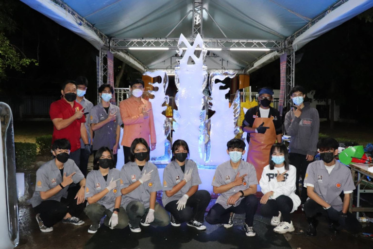 ทั้งนี้ กิจกรรมดังกล่าว วิทยาลัยอาชีวศึกษาอุบลราชธานี ได้รับเชิญ จากมหาวิทยาลัยอุบลราชธานี ดูแลและรับผิดชอบการจัดกิจกรรมในครั้งนี้ ให้รังสรรค์ผลงาน ดังกล่าวอย่างสุดฝีมือ ในชื่อผลงาน “เทิดไท้องค์ราชัน” อันมีแนวคิดมาจาก การเทิดพระเกียรติ พระบาทสมเด็จพระเจ้าอยู่หัว ในหลวงรัชกาลที่ 10 เนื่องในวันเฉลิมพระชนมพรรษา ตรงกับวันที่ 28 กรกฎาคม ของทุกปี ซึ่งเป็นวันคล้ายวันพระราชสมภพ โดยรังสรรค์ก้อนน้ำแข็ง ด้วยการแกะสลักลวดลายอย่างงดงาม ตรงส่วนกลางของผลงาน เป็นสัญลักษณ์รูปหยดน้ำ ด้านบนมีอักษรหมายเลข 10 ตัวเลขไทย ซึ่งหมายถึง ประชาชนได้รับน้ำพระทัยจากในหลวงรัชกาลที่10 ที่พระองค์ทรงมีพระเมตตาดูแลห่วงใยประชาชนเสมอมาอย่างหาที่สุดมิได้ ถัดมาจะเป็นรูปนาค หรือ พญานาค ตั้งอยู่ด้านซ้ายและขวาของหยดน้ำ ซึ่งเป็นสัญลักษณ์ความเชื่อถือศรัทธาของคนอีสานที่เชื่อว่า พญานาค เป็นสัญลักษณ์ของน้ำ ความยิ่งใหญ่ ความอุดมสมบูรณ์ ความมีวาสนา อุดมสมบูรณ์ มีอยู่ มีกิน และถัดมา จะประดับตกแต่งความงดงามด้วยการแกะสลักน้ำแข็งรูปลายกนกไทย อันหมายถึง ความเลื่อมใสศรัทธาในพระพุทธศาสนา และสืบสานศิลปวัฒนธรรมอันดีงามของชาวอีสาน เมืองดอกบัวงาม
