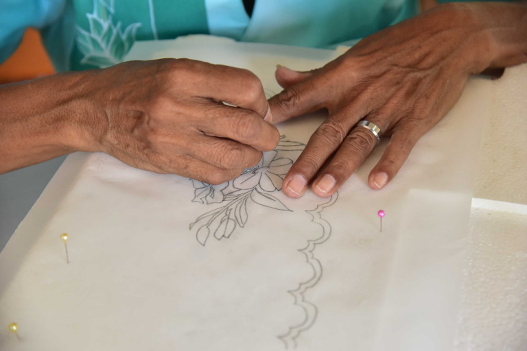 นางมัณฑนา ชูพินิจ อายุ 72 ปี เลขานุการกลุ่มแม่บ้านเกษตรบ้านกระแชง เล่าว่า สมาชิกโดยส่วนใหญ่ เป็นผู้สูงอายุ ทางกลุ่มยังขาดทักษะและวิธีในการเขียนลวดลาย ทางกลุ่มจึงนำสไบมอญสำเร็จที่มีขายตามท้องตลาดมาปัก 1 ผืนราคาประมาณ 200 – 300 บาท ใช้เวลาในการปักมือประมาณ1อาทิตย์ต่อ 1 ผืน ขึ้นอยู่กับความชำนาญของแต่ละคน โดยลวดลายตามท้องตลาดเป็นลวดลายเดิมๆ จึงอยากเขียนลวดลายเอง อยากมีความรู้ วิธีและลวดที่อาจารย์นำมาสอนในวันนี้ เป็นวิธีที่ง่ายและสะดวก และมีลวดลายใหม่ๆ สอนเทคนิคคัดลอกลวดลายลงผ้า ทำให้ประหยัดงบค่าใช้จ่าย ได้ลวดลายที่ต้องการ ในอนาคตมีลวดลายที่เป็นเอกลักษณ์เฉพาะของกลุ่ม สร้างรายได้ให้กับทางกลุ่มต่อไป
