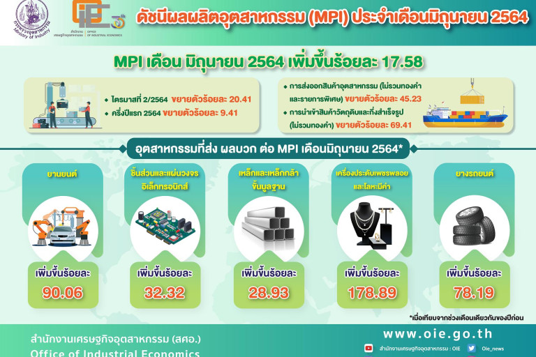 นายทองชัย ชวลิตพิเชฐ ผู้อำนวยการสำนักงานเศรษฐกิจอุตสาหกรรม (สศอ.) กล่าวว่า ดัชนีผลผลิตอุตสาหกรรม (MPI) เดือนมิถุนายน 2564 ขยายตัวติดต่อกันเป็นเดือนที่ 4 อยู่ที่ระดับ 97.73 เพิ่มขึ้นร้อยละ 17.58 เมื่อเทียบกับเดือนเดียวกันของปีก่อน โดยไตรมาสที่ 2/64 ขยายตัวเฉลี่ยร้อยละ 20.41 ส่วนครึ่งปีแรกปี 2564 ขยายตัวเฉลี่ยร้อยละ 9.41 โดยการส่งออกสินค้าอุตสาหกรรม (ไม่รวมทอง อาวุธ รถถัง และอากาศยาน) มูลค่า 18,440 ดอลล่าร์สหรัฐ ขยายตัวสูงถึงร้อยละ 45.23 ส่วนการนำเข้าสินค้าทุน ขยายร้อยละ 28.5 ได้แก่ เครื่องจักรกลและส่วนประกอบ เครื่องจักรไฟฟ้าและส่วนประกอบ และการนำเข้าสินค้าวัตถุดิบและกึ่งสำเร็จรูป (ไม่รวมทองคำ) ขยายตัวร้อยละ 69.4 ได้แก่ เหล็ก เหล็กกล้าและผลิตภัณฑ์ เคมีภัณฑ์ เป็นต้น