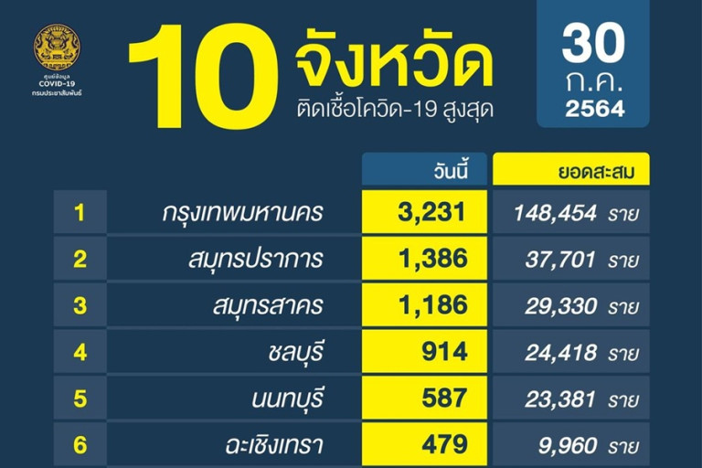 เมื่อวันที่ 30 ก.ค.64 ศูนย์ข้อมูลโควิด-19 ได้รายงานสถานการณ์ผู้ป่วยติดเชื้อในประเทศไทย ข้อมูล ณ วันที่ 30 ก.ค.64 เวลา 01.00 น. โดยพบผู้ติดเชื้อทั้ง 77 จังหวัดของประเทศไทย จังหวัดที่พบผู้ติดเชื้อรายใหม่และสะสมสูงที่สุดคือกทม.3,231 ราย ที่แม้วันนี้รายใหม่จะลดลงแต่ยังคงสูงอยู่ ขณะที่จังหวัดที่พบผู้ติดเชื้อรายใหม่น้อยที่สุดคือ แม่ฮ่องสอน 6 ราย ขณะพบ 39 จังหวัดที่มีจำนวนผู้ติดเชื้อรายใหม่เกินร้อย สูงสุดยังคงเป็นภาคกลาง ติดเชื้อรายใหม่เกินร้อยมี 13 จังหวัดคือ กทม. ตามด้วยสมุทรปราการ ที่วันนี้ยอดรายใหม่สูงสุดเป็นประวัติการณ์ 1,386 ราย ตามด้วยสมุทรสาคร 1,186 ราย นนทบุรี ปทุมธานี นครปฐม อยุธยา ลพบุรี สระบุรี นครสวรรค์ สุพรรณบุรี อ่างทอง เพชรบูรณ์ ตามด้วยภาคตะวันออกเฉียงเหนือ มี 12 จังหวัดที่ติดเชื้อรายใหม่เกินร้อย สูงสุดที่อุบลราชธานี ตามด้วยสุรินทร์ ศรีสะเกษ มหาสารคาม นครราชสีมา ร้อยเอ็ด บุรีรัมย์ กาฬสินธุ์ ชัยภูมิ ขอนแก่น ยโสธร และสกลนคร ภาคใต้ ติดเชื้อรายใหม่เกินร้อยมี 6 จังหวัดคือ สงขลา ยะลา ปัตตานี นราธิวาส นครศรีธรรมราช และสุราษฎร์ธานี ภาคตะวันตก พบ 4 จังหวัดติดเชื้อใหม่เกินร้อย ได้แก่ ตาก กาญจนบุรี เพชรบุรี และราชบุรี ภาคตะวันตก 4 จังหวัดติดเชื้อเกินร้อย ชลบุรี ที่จ่อแตะหลักพัน ฉะเชิงเทรา ระยอง และสระแก้ว ขณะที่ภาคเหนือ ติดเชื้อรายใหม่ยังไม่มีจังหวัดใดเกินร้อย แต่มีอุตรดิตถ์ที่ตัวเลขจ่อใกล้ร้อยอยู่ที่ 95 ราย