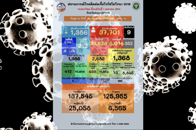 สถานการณ์ผู้ติดเชื้อไวรัสโควิด-19 ในจังหวัดสมุทรปราการ พบผู้ติดเชื้อรายใหม่จำนวน 1,386 ราย เป็นผู้ป่วยในพื้นที่จำนวน 1,174 ราย อำเภอเมืองสมุทรปราการจำนวน 463 ราย อำเภอพระประแดงจำนวน 253 ราย อำเภอพระสมุทรเจดีย์จำนวน 126 ราย อำเภอบางพลีจำนวน 247 ราย อำเภอบางบ่อจำนวน 40 ราย อำเภอบางเสาธงจำนวน 45 ราย โรงพยาบาลเอกชนรับมารักษาต่อในสมุทรปราการจำนวน 212 ราย เสียชีวิต 9 ราย เป็นเพศชายจำนวน 6 ราย เพศหญิงจำนวน 3 ราย อายุระหว่าง 53 - 87 ปี มีโรคประจำตัว 6 ราย ไม่ระบุจำนวน 3 ราย รวมเสียชีวิตสะสม 352 ราย การตรวจคัดกรองเฝ้าระวังในคลินิก ARI และในชุมชน จำนวน 263,500 ราย พบเชื้อ 31,623 ราย ผู้ป่วยสะสมระลอกใหม่ตั้งแต่วันที่ 1 เมษายน จนถึงปัจจุบันจำนวน 37,701 ราย ในพื้นที่ 31,623 ราย นอกพื้นที่ 6,078 ราย กำลังรักษาในโรงพยาบาลของรัฐจำนวน 1,986 ราย กำลังรักษาในโรงพยาบาลเอกชนจำนวน 2,683 ราย รักษาใน Hospitel มหาวิทยาลัยราชภัฏธนบุรีสมุทรปราการ จำนวน 1,368 ราย คลัสเตอร์ใหม่ บริษัท ระบบกำลังไฟฟ้า เขตอำเภอเมืองสมุทรปราการ จำนวน 10 ราย ส่วนที่เหลือเป็นคลัสเตอร์เดิมที่เกิดการแพร่กระจายเชื้อโควิดไปติดคนในครอบครัวและคนใกล้ชิด รวมทั้งเพื่อนคนงานด้วยกัน ผู้ป่วยติดเชื้อได้แต่นอนรอที่บ้านเพราะโรงพยาบาลเตียงเต็ม เมื่อทางโรงพยาบาลมีเตียงว่างจะติดต่อกลับไปโดยจะมีรถพยาบาลไปรับมารักษาต่อที่โรงพยาบาลหรือโรงพยาบาลสนามต่อไป