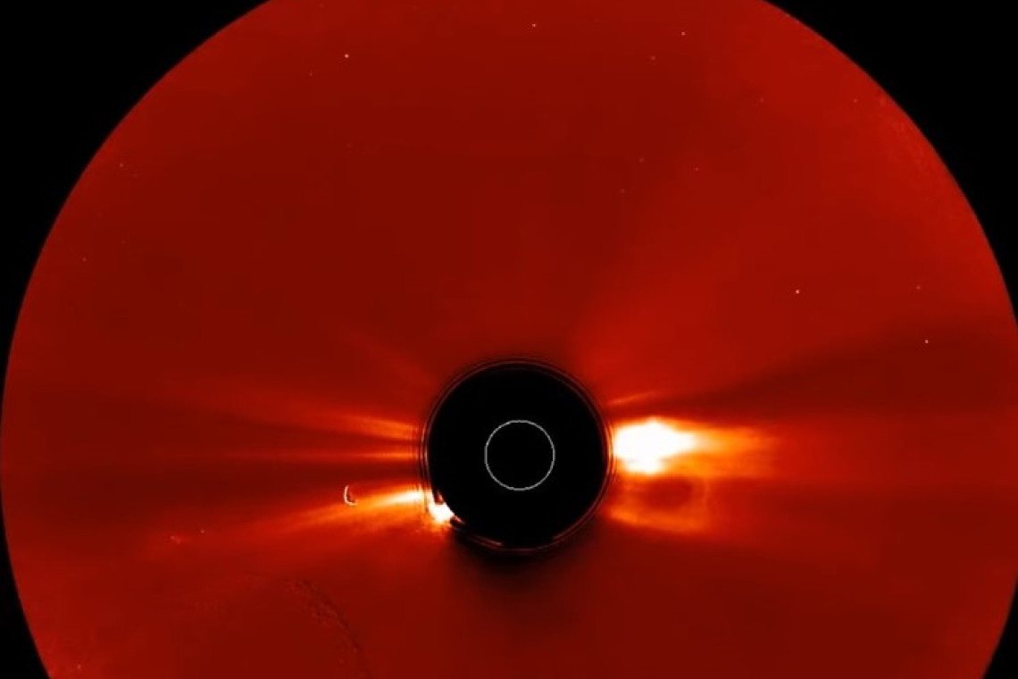 (ภาพถ่าย CME ในอีกมุมหนึ่ง บันทึกโดยยาน STEREO-A ของนาซา ซึ่งเป็นครั้งเดียวกับที่ยาน Solar Orbiter บันทึกได้ (ภาพ : NASA/STEREO/COR2z)