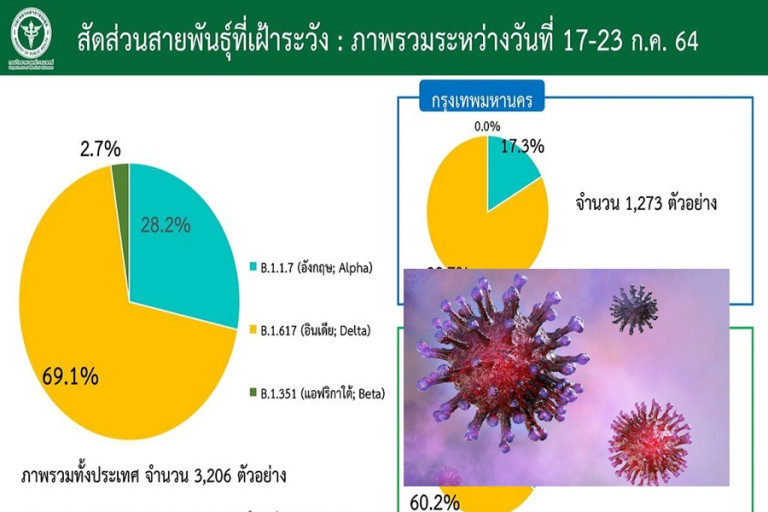 นายแพทย์ศุภกิจ ศิริลักษณ์ อธิบดีกรมวิทยาศาสตร์การแพทย์ เปิดเผยผลการเฝ้าระวังสายพันธุ์โควิด 19 ในประเทศไทย โดยกรมวิทยาศาสตร์การแพทย์ กระทรวงสาธารณสุข ร่วมกับเครือข่ายห้องปฏิบัติการว่า แนวโน้มในภาพรวมของประเทศจากข้อมูลการเฝ้าระวังระหว่างวันที่ 17-23 กรกฎาคม 2564 จากการสุ่มตรวจพบผู้ติดเชื้อทั้งหมด 3,206 ราย เป็นสายพันธุ์เดลตา (อินเดีย) จำนวน 2,215 ราย (69.1%) ซึ่งมีแนวโน้มเพิ่มขึ้นค่อนข้างรวดเร็ว ส่วนสายพันธุ์อัลฟา (อังกฤษ) พบจำนวน 905 ราย (28.2%) และสายพันธุ์เบตา (แอฟริกาใต้) จำนวน 86 ราย (2.7%) โดยพบในพื้นที่กรุงเทพมหานคร จากทั้งหมดจำนวน 1,273 ราย เป็นสายพันธุ์เดลตา จำนวน 1,053 ราย (82.7%) สายพันธุ์อัลฟาจำนวน 220 ราย (17.3%) ส่วนสายพันธุ์เบตาไม่พบผู้ติดเชื้อ