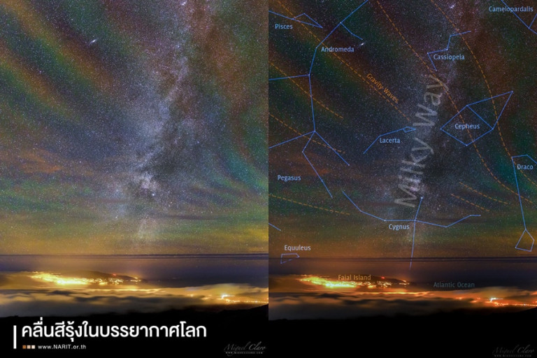 NARIT สถาบันวิจัยดาราศาสตร์แห่งชาติ โพสต์ผ่านเฟซบุ๊กระบุ "ท้องฟ้าเหนือหมู่เกาะอะโซร์ส (Azores) ของโปรตุเกส เติมเต็มไปด้วยสีสันสวยงามราวกับมีคลื่นสีรุ้งกระจายทั่วทั้งฟ้า