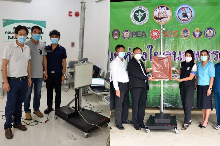 หลังพบปัญหานำเครื่องมาใช้ในรพ.สนาม คนป่วยต้องเอกซเรย์ปอดวันละ 2 รอบ/คน และต้องมีการสัมผัสจับตัวคนไข้จัดท่ายืนให้ได้มุม ก่อความเสี่ยงกับเจ้าหน้าที่รังสี จึงปรับใช้เป็นวิธีการบังคับอุปกรณ์ไม่ต้องมีการสัมผัสตัวคนป่วย เผยจัดสร้างได้แล้ว 20 เครื่อง ด้วยเงินบริจาคส่งมอบให้รพ.สนามใช้จริงแล้ว ตกต้นทุน 6 หมื่น/เครื่อง อนาคตเตรียมพัฒนาไปใช้กับงานเอกซเรย์ผ่าตัดอื่นๆ ต่อไป พร้อมเชิญชวนผู้มีจิตศรัทธาร่วมบริจาคสร้างเพิ่มส่งมอบรพ.สนามต่อไป