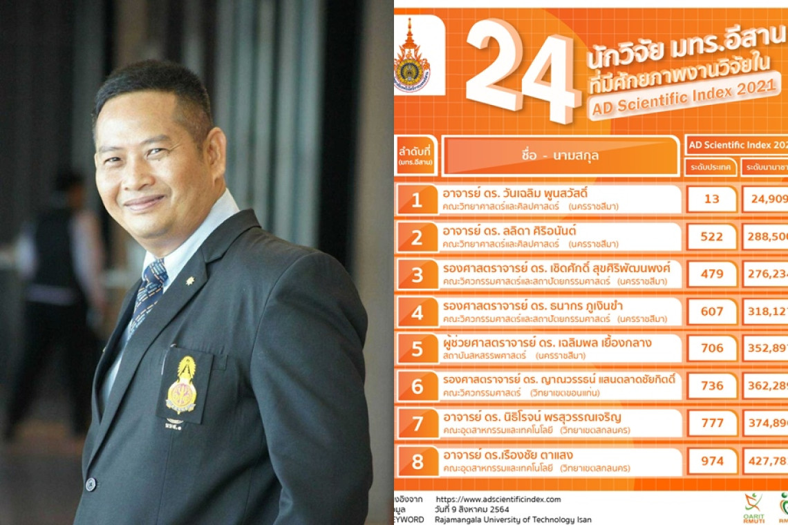 ในส่วนของผลการจัดอันดับนักวิจัยที่มีศักยภาพ ระดับมหาวิทยาลัย ระดับประเทศ และระดับโลก จากฐานข้อมูล AD Scientific Index 2021: World Scientist and University Rankings 2021 พบว่ามีคณาจารย์ มทร.อีสาน 24 ท่าน ที่ได้รับการจัดอันดับนักวิจัยในระดับประเทศ และระดับโลก ตนขอเป็นตัวแทนแสดงความยินดีและขอชื่นชมอาจารย์ทั้ง 24 ท่านและขอเป็นกำลังใจให้อาจารย์ มทร.อีสาน ทุกท่านผลิตผลงานวิจัยที่มีคุณภาพมากขึ้นเรื่อยๆ ครับ โดยผลการจัดอันดับมหาวิทยาลัย นับเป็นวิธีการหนึ่งที่มหาวิทยาลัยใช้ในการเปรียบเทียบตัวชี้วัดคุณภาพ (KPI) ของมหาวิทยาลัย ซึ่งเป็นสิ่งที่ช่วยให้นักศึกษา ผู้ปกครองใช้ประกอบการพิจารณาตัดสินใจเลือกที่จะมาเรียนกับ มทร.อีสาน และ Ranking ที่เราเข้าเกณฑ์ล้วนแล้วแต่มีคุณภาพและเชื่อถือได้