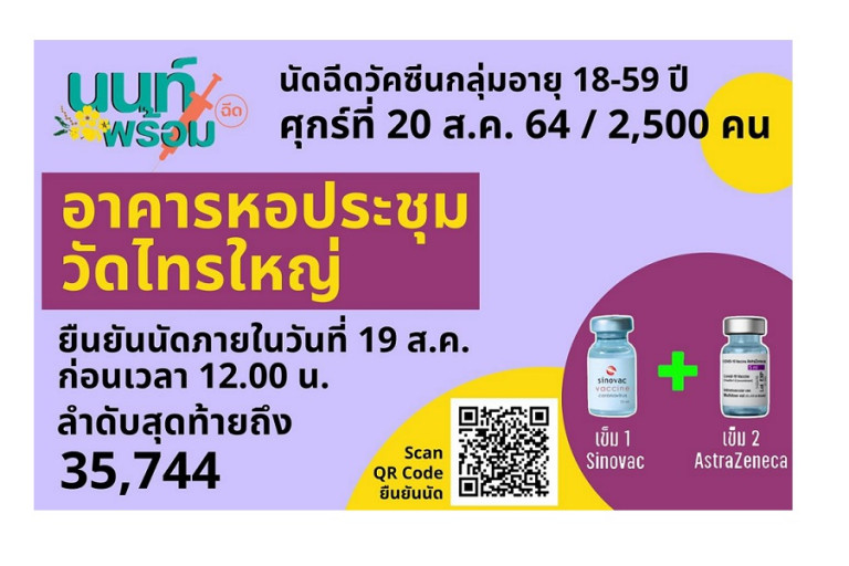 วันที่ 16 ส.ค.64 เพจเฟซบุ๊ก สำนักงานสาธารณสุขจังหวัดนนทบุรี ได้เผยแพร่ข้อมูล โดยมีข้อความ ระบุว่า...แจ้งนัดฉีดวัคซีน กับ "นนท์พร้อม" สูตร Sinovac + AstraZeneca ที่ อาคารหอประชุมวัดไทรใหญ่ ใน วันศุกร์ที่ 20 ส.ค. 64 จำนวน 2,500 คน ให้ยืนยันนัดภายในวันที่ 19 ส.ค. ก่อนเวลา 12.00 น.