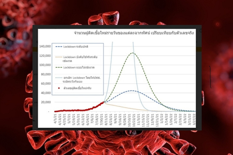 ขณะนี้ในหลายประเทศมีการระบาดของเชื้อโควิด-19 สายพันธุ์เดลต้า โดยเฉพาะประเทศที่มีสัดส่วนการฉีดวัคซีนต่อประชากรต่ำ ได้มีการล็อคดาวน์และบังคับใช้อย่างเข้มข้น เช่น มีเจ้าหน้าที่คอยตรวจตราประชาชนตามท้องถนนเพื่อป้องกันไม่ให้มีการรวมกลุ่มกัน ซึ่ง ณ ปัจจุบันนี้ดูเหมือนเวียดนามเริ่มมีสัญญาณที่สามารถควบคุมการระบาดได้แล้ว เนื่องจากจำนวนผู้ติดเชื้อรายวันเริ่มทรงตัวไม่เพิ่มขึ้น หลังจากที่ล็อคดาวน์อย่างเข้มข้นมาประมาณ 1 เดือน ทั้งๆ ที่เวียดนามมีสัดส่วนการฉีดวัคซีนของประชากรที่ต่ำ นั่นเป็นหลักฐานสำคัญว่าการบังคับใช้มาตรการล็อคดาวน์อย่างจริงจังและเข้มข้นสามารถที่จะควบคุมการระบาดลงได้จริง ประเทศไทยดูเหมือนว่าการบังคับใช้มาตรการล็อคดาวน์ยังไม่เข้มข้นเท่าประเทศอื่น ยังคงมีการรวมกลุ่มกัน เช่น การชุมนุมประท้วงกันกลางถนน และเหตุการณ์การหละหลวมต่อการปฏิบัติงาน เพื่อให้เห็นถึงภาพสถานการณ์ระดับความวิกฤติที่อาจจะเกิดขึ้นในอนาคต ผู้เขียนได้ทำการศึกษาแบบจำลองการระบาด โดยใช้ข้อมูลจนถึงวันที่ 4 สิงหาคม 2564 เพื่อแสดงผลออกมา 4 ฉากทัศน์ ตามรูปที่ 1 โดยผลที่แสดงนี้ตั้งอยู่บนสมมติฐานที่ว่าเราสามารถขยายเพิ่มปริมาณความสามารถในการตรวจเชื้อให้เพียงพอ โดยคง positive rate ไว้ไม่ให้เกิน 23% รูปที่ 1: จำนวนผู้ติดเชื้อใหม่รายวันของทั้ง 4 ฉากทัศน์ เทียบกับจำนวนผู้ติดเชื้อจริง จากการศึกษาพบว่ากรณีบังคับใช้มาตรการล็อกดาวน์ในระดับปกติทำให้คนลดกิจกรรมเหลือ 24.68% พบว่าจำนวนผู้ติดเชื้อใหม่จะพุ่งสูงสุดถึงระดับ 40,000 คนตอนช่วงกลางเดือนตุลาคม และจะเริ่มลดระดับลงจนสิ้นสุดการระบาดในช่วงไตรมาศแรกของปี 2565 และจะมีจำนวนผู้เสียชีวิตสะสมสูงถึง 75,000 คน กรณีบังคับใช้มาตรการล็อกดาวน์ในระดับเข้มงวด ทำให้คนลดกิจกรรมเหลือ 19.5% พบว่าจำนวนผู้ติดเชื้อใหม่จะสูงสุดที่ 20,000 คน แล้วจะเริ่มลดลงจนสิ้นสุดการระบาดตอนช่วงปลายเดือนมกราคมปี 2565 ส่งผลให้จำนวนผู้เสียชีวิตลดลงเหลือเพียง 20,000 คน กรณีบังคับใช้มาตรการล็อกดาวน์แบบไม่เข้มงวด ทำให้คนลดกิจกรรมเหลือ 28.29% จำนวนผู้ติดเชื้อใหม่จะไต่ระดับขึ้นจากระดับปัจจุบันถึง 6 เท่า ไปสูงสุดที่ 130,000 คน ตอนช่วงกลางตุลาคม จากนั้นจึงค่อยลดลงจนสิ้นสุด การระบาดตอนปลายไตรมาสที่ 1 ปี 2565 ส่งผลให้จำนวนผู้เสียชีวิตสะสมเท่ากับ 150,000 คน กรณียกเลิกมาตรการล็อกดาวน์ในขณะที่เชื้อยังระบาดเป็นวงกว้างและโรงพยาบาลไม่มีเตียงรับรักษาผู้ป่วย ทำให้คนลดกิจกรรมเหลือ 40% จะเห็นว่าจำนวนผู้ติดเชื้อใหม่จะพุ่งสูงขึ้นเป็นทวีคูณและไปสูงสุดที