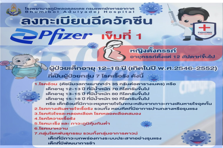 ผู้สื่อข่าวรายงานว่า เพจเฟซบุ๊ก "โรงพยาบาลภูมิพลอดุลยเดช พอ." โพสต์ข้อความระบุว่า... รพ.ภูมิพลอดุลยเดช ขอเชิญหญิงตั้งครรภ์ ที่มีอายุครรภ์ ตั้งแต่ 12 สัปดาห์ขึ้นไป และกลุ่มผู้ป่วยเด็ก อายุ 12-18 ปี กลุ่มโรคเรื้อรัง 7 โรค (รายละเอียดตามเอกสารแนบ) ?ลงทะเบียนฉีดวัคซีนไฟเซอร์ เข็มที่ 1? เริ่มลงทะเบียน ตั้งแต่วันพุธ ที่ 18 สิงหาคม 2564 เวลา 08.30-11.00 น. ทุกวันราชการ จนกว่าวัคซีนจะหมด *เป็นการลงทะเบียนจองล่วงหน้า แล้วนัดวันมาฉีด* ▪️ หญิงตั้งครรภ์สามารถใช้เอกสารใบฝากครรภ์จากโรงพยาบาลหรือคลินิกอื่น เพื่อเป็นหลักฐานในการลงทะเบียนได้ ▪️ คนไข้เด็กต้องมีประวัติการรักษาที่ รพ.ภูมิพลอดุลยเดช พอ. ________________ ?สอบถามเพิ่มเติมได้ทาง Line : @bhumibolhospital