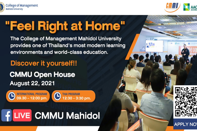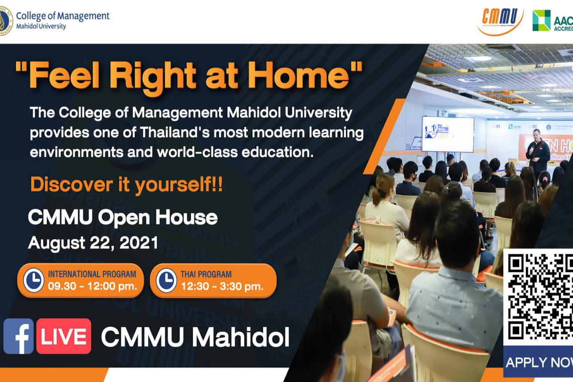 วิทยาลัยการจัดการ มหาวิทยาลัยมหิดล (CMMU) ชวนผู้สนใจศึกษาต่อปริญญาโท การจัดการหลักสูตรไทยและนานาชาติ รับรองมาตรฐานระดับโลก โดย AACSB ร่วมงานเปิดบ้านการเรียนรู้ “CMMU Open House 2021” รูปแบบออนไลน์ ไลฟ์สดผ่านเฟซบุ๊ก CMMU Mahidol ที่จะทำให้คุณค้นพบคำตอบในใจ และรู้จักตนเองในการวางแผนอนาคตมากยิ่งขึ้น ผ่านการแนะนำหลักสูตรที่ทันสมัย การทดลองเรียนจริง (Demo Class) เพื่อเปิดประสบการณ์ระดับนานาชาติ โดยคณาจารย์ทั้งชาวไทยและชาวต่างชาติผู้มากประสบการณ์ในอุตสาหกรรมจริงอย่างลึกซึ้ง พร้อมโอกาสให้ถาม-ตอบแนวทางการสมัครเข้าเรียนสาขาที่สนใจสุดอินไซต์ ผ่านการแบ่งห้องตามสาขาวิชา (Breakout Room) ร่วมด้วยนักศึกษาปัจจุบัน หรือศิษย์เก่า CMMU-DNA มาแชร์เรื่องราวสุดเอ็กซ์คลูซีฟ ตั้งแต่เวลา 09.30 – 15.30 น. ในวันอาทิตย์ที่ 22 สิงหาคม 2564 พร้อมรับส่วนลดค่าเรียนทันที สำหรับผู้ที่สมัครเข้าศึกษาต่อในวันงานเท่านั้น!! ลงทะเบียนเข้าร่วมงานได้แล้ววันนี้ที่ https://admission.cm.mahidol.ac.th/onlineadmission/link/op/