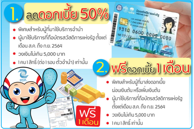 วันที่ 18 ส.ค.64 เฟซบุ๊กเพจ สธค. โรงรับจำนำของรัฐ โพสต์ข้อความเพื่อแจ้งสิทธิพิเศษผู้ใช้บริการโรงรับจำนำของรัฐ และเป็นผู้ถือบัตรสวัสดิการแห่งรัฐ หรือบัตรคนจน โดยมีรายละเอียดดังนี้