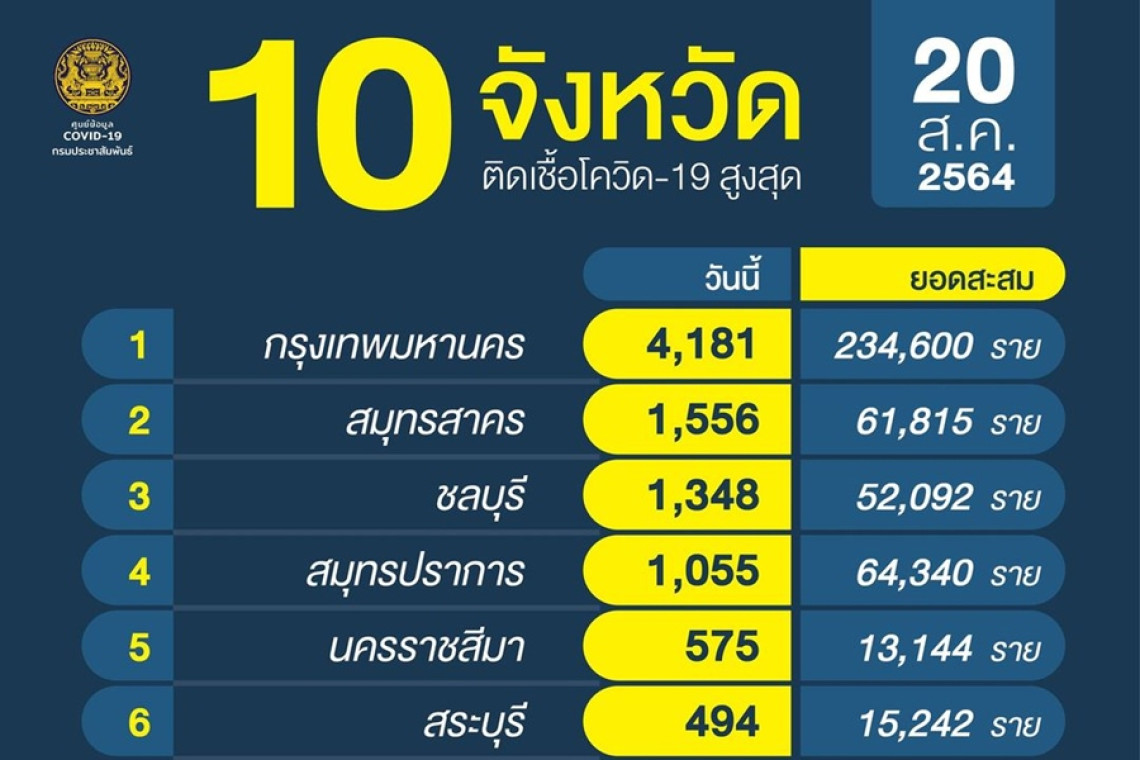 เมื่อวันที่ 20 ส.ค.64 ศูนย์ข้อมูลโควิด-19 ได้รายงานสถานการณ์ผู้ป่วยติดเชื้อไวรัสโควิด-19 ในประเทศไทย ข้อมูลวันที่ 20 ส.ค.64 เวลา 01.00 น. พบผู้ติดเชื้อรายใหม่ในทั้ง 77 จังหวัดของประเทศไทย โดยจังหวัดที่พบผู้ติดเชื้อรายใหม่มากที่สุดและยอดสะสมสูงสุดยังคงเป็นกทม. โดยวันนี้อยู่ที่ 4,182 ราย ตามด้วยอีก 3 จังหวัดที่รายใหม่อยู่ในหลักพัน คือ สมุทรสาคร 1,556 ราย แม้ลดลงแต่ยังคงสูงอยู่ ชลบุรี 1,348 ราย สมุทรปราการ 1,055 ราย เพิ่มขึ้นจากเมื่อวานที่หล่นจากหลักพัน ขณะจังหวัดที่พบผู้ป่วยติดเชื้อรายใหม่น้อยที่สุดคือ แม่ฮ่องสอน 1 ราย