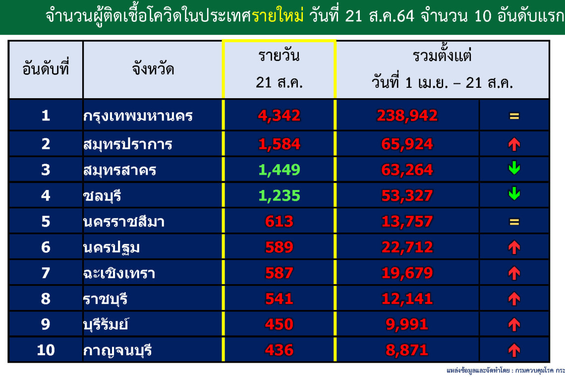 เมื่อวันที่ 21 ส.ค.64 ศูนย์ข้อมูลโควิด-19 รายงานสถานการณ์ผู้ป่วยติดเชื้อไวรัสโควิด-19 ในประเทศไทย ข้อมูลวันที่ 21 ส.ค.64 เวลา 01.00 น. ประเทศไทยยังคงพบผู้ติดเชื้อรายใหม่ในทั้ง 77 จังหวัด โดยจังหวัดที่พบผู้ติดเชื้อรายใหม่มากที่สุดและยอดติดเชื้อสูงสุดยังคงเป็นกทม. ที่วันนี้ตัวเลขขยับเพิ่มขึ้นจากเมื่อวาน 4,342 ราย ตามด้วยสมุทรปราการ ที่วันนี้ขึ้นมาเป็นอันดับ 2 ขณะสมุทรสาคร วันนี้รายใหม่ลดลง และชลบุรี ที่ยังคงอยู่ในหลักพัน โดยจังหวัดที่พบผู้ติดเชื้อรายใหม่น้อยที่สุดคือ แม่ฮ่องสอน 2 ราย ท้ังนี้ พบมีผู้ติดเชื้อรายใหม่เกินร้อยใน 47 จังหวัด
