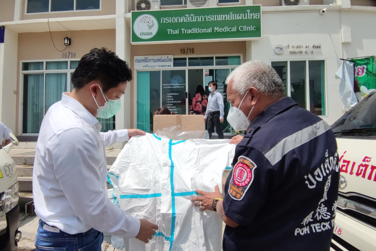 เมื่อเวลา 11.00 น. วันที่ 22 สิงหาคม นายชุมพร เกิดแก้ว พร้อมด้วยนายปวัน เกิดแก้ว ผู้บริหารกรเอกคลีนิกการแพทย์แผนไทย พท.นัฐพงษ์ วงศ์วิริยะชัย แพทย์ประจำกรเอกคลีนิกการแพทย์แผนไทย และนายสกุลพล ตั้งจัตุรัสมั่นคง กรรมการผู้จัดการ บริษัท เอ็มเจที ไทยแลนด์ จำกัด มอบชุด PPE ถุงมือทางการแพทย์ แอลกอฮอร์ หน้ากากอนามัย จำนวนกว่า 500 ชุด ให้กับอาสาสมัครมูลนิธิป่อเต็กตึ๊ง จุด สน.ดอนเมือง เพื่อใช้สวมใส่ขณะออกช่วยเหลือประชาชนในห้วงการระบาดของเชื้อโควิด -19