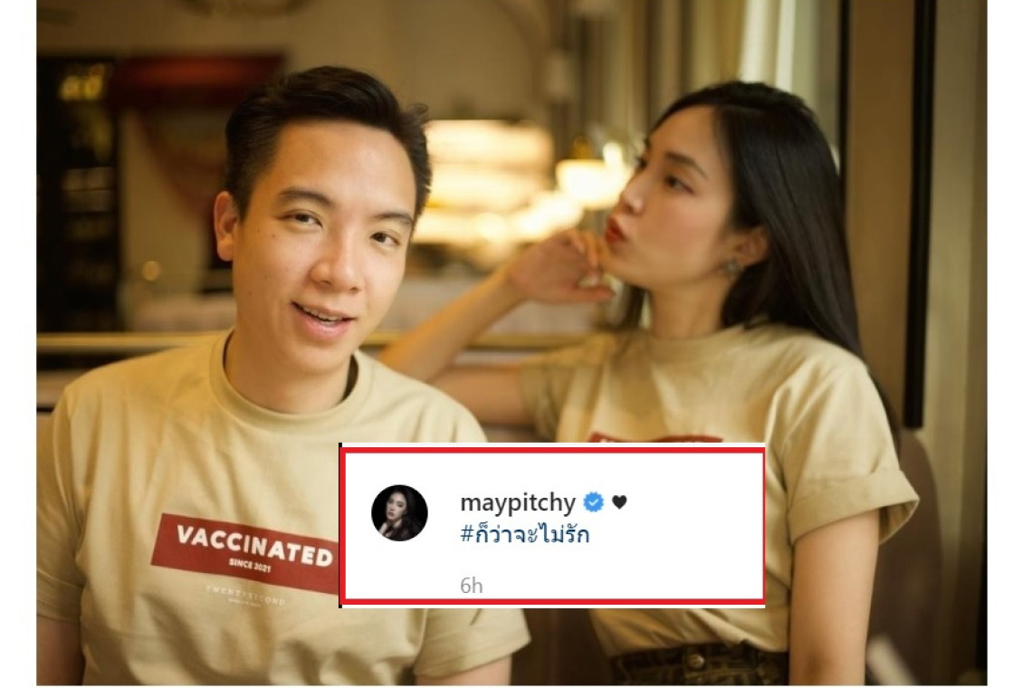 แต่ล่าสุด สาวเมย์ พิชญ์นาฏ ได้โพสต์ภาพคู่กับหวานใจ ไฮโซบิ๊ก และข้อความ ว่า..วันนี้แฟนน่ารักจัง พร้อมแคปชั่นรูปหัวใจ ติดแฮชแท็ก ว่า ก็ว่าจะไม่รัก