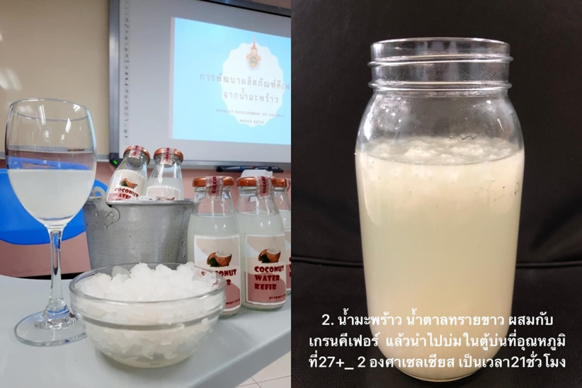 ด้าน นางสาวอัมรินทร์ คำนุ กล่าวว่า ผลิตภัณฑ์คีเฟอร์จากน้ำมะพร้าว เริ่มต้นการพัฒนาสูตรการหมักด้วยการนำน้ำมะพร้าว ผสมกับน้ำตาลทรายขาว และใส่หัวเชื้อคีเฟอร์เกรนส์เป็นระยะเวลา 21 ชั่วโมง ซึ่งเป็นระยะเวลาที่คีเฟอร์เจริญเติบโตได้ดี โดยขั้นตอนการทำเริ่มจาก ใส่น้ำมะพร้าวจำนวน 500 มิลลิลิตร น้ำตาลทรายขาว 90 กรัม และหัวเชื้อคีเฟอร์น้ำ (water kefir) 45 กรัม ลงในภาชนะหมักที่เป็นโหลแก้วขนาด 500 ml. ปิดฝาหลวมๆ และทิ้งไว้ที่อุณหภูมิ 27 องศาเซลเซียส เป็นเวลา 21 ชั่วโมง