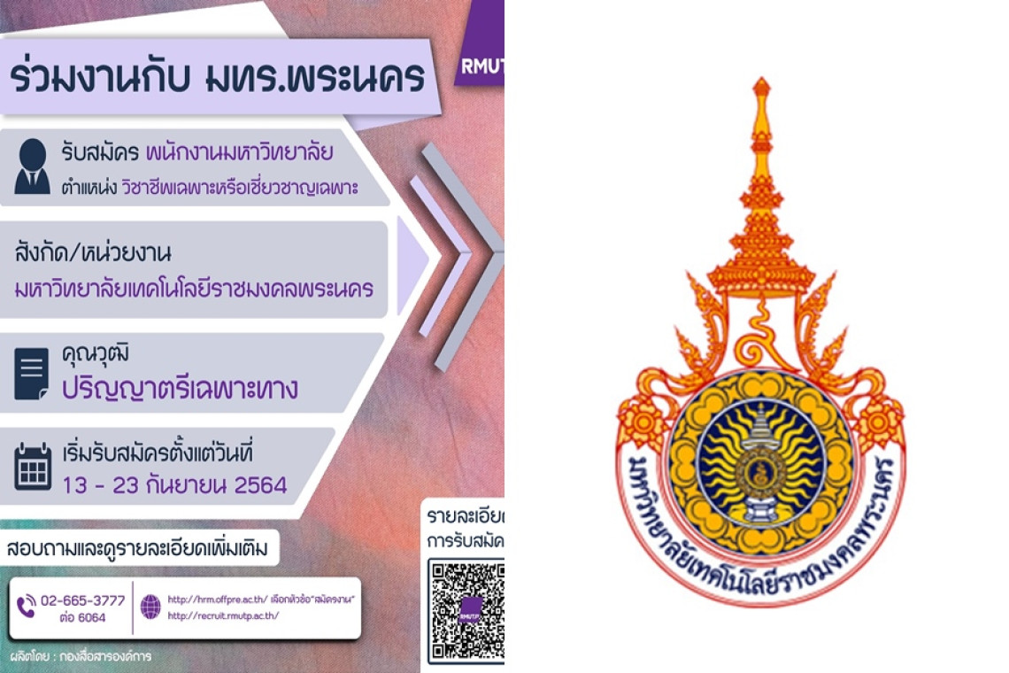 มหาวิทยาลัยเทคโนโลยีราชมงคลพระนคร รับสมัครบุคคลเข้าสอบแข่งขันเพื่อจ้างเป็นพนักงานมหาวิทยาลัย ตำแหน่งวิชาชีพหรือเชี่ยวชาญเฉพาะ จำนวน 17 อัตรา ครั้งที่ 4/2564 ตำแหน่ง 1.เจ้าหน้าที่บริหารงานทั่วไปปฏิบัติการ สถาบันวิจัยและพัฒนา 2.นักวิจัยปฏิบัติการ สถาบันวิจัยและพัฒนา 3.บรรณารักษ์ปฏิบัติการ สำนักวิทยบริการและเทคโนโลยีสารสนเทศ 4.นักวิชาการคอมพิวเตอร์ปฏิบัติการ สำนักวิทยบริการและเทคโนโลยีสารสนเทศ 5.นักวิชาการคอมพิวเตอร์ปฏิบัติการ สำนักวิทยบริการและเทคโนโลยีสารสนเทศ 6.เจ้าหน้าที่บริหารงานทั่วไปปฏิบัติการ สำนักส่งเสริมวิชาการและงานทะเบียน 7.นักวิชาการศึกษาปฏิบัติการ สำนักส่งเสริมวิชาการและงานทะเบียน 8.เจ้าหน้าที่บริหารงานทั่วไปปฏิบัติการ กองกลาง 9.นักวิชาการเงินและบัญชีปฏิบัติการ กองคลัง 10.นักวิชาการเงินและบัญชีปฏิบัติการ กองคลัง 11.นักวิเคราะห์นโยบายและแผนปฏิบัติการ กองนโยบายและแผน 12.นักวิเคราะห์นโยบายและแผนปฏิบัติการ กองนโยบายและแผน 13.สถาปนิกปฏิบัติการ กองนโยบายและแผน 14.บุคลากรปฏิบัติการ กองบริหารงานบุคคล 15.นักวิชาการศึกษาปฏิบัติการ กองพัฒนานักศึกษา 16.เจ้าหน้าที่บริหารงานทั่วไปปฏิบัติการ สำนักงานสภามหาวิทยาลัย 17.วิศวกรเครื่องกลปฏิบัติการ กองกายภาพและสิ่งแวดล้อม ผู้สนใจดูรายละเอียด หลักเกณฑ์ และคุณสมบัติเพิ่มเติมที่ https://recruit.rmutp.ac.th/register/ และยื่นใบสมัครได้ตั้งแต่วันที่ 13 -23 กันยายน 2564 ผ่านระบบรับสมัครงานออนไลน์ ตลอด 24 ชั่วโมง และจะประกาศผลผู้มีสิทธิ์สอบในวันที่ 1 ตุลาคม 2564
