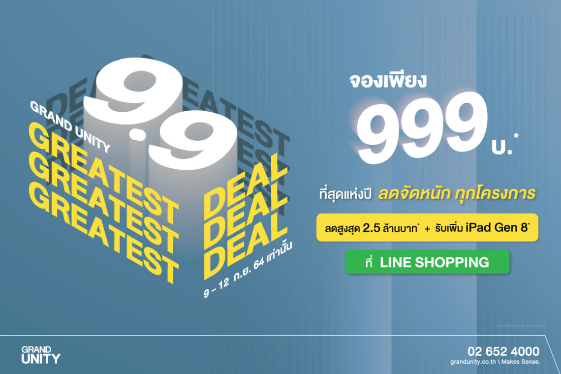 แกรนด์ ยูนิตี้ ส่งโปรฯ แห่งปี ‘9.9 THE GREATEST DEAL’ เจาะกลุ่มนักช้อปออนไลน์จองคอนโดพร้อมอยู่ 999 บาท* ผ่าน LINE SHOPPING ลดสูงสุด 2.5 ล้านบาท*