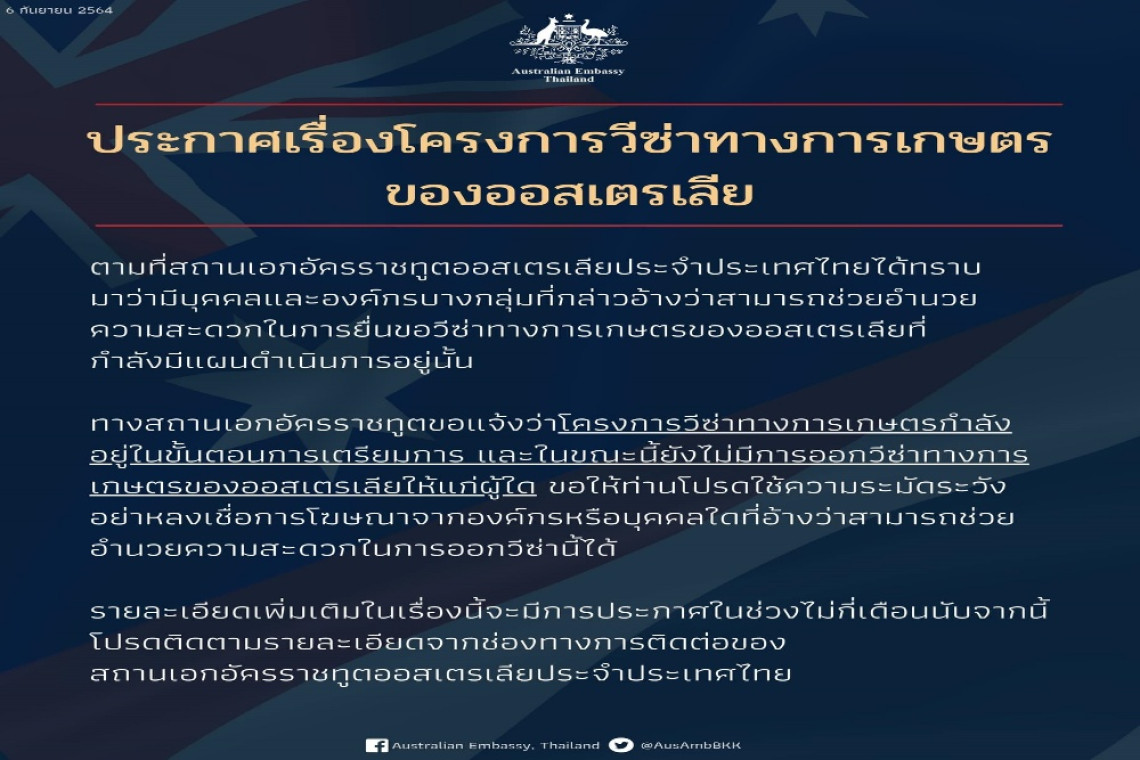 ทางสถานเอกอัครราชทูตขอแจ้งว่าโครงการวีซ่าทางการเกษตรกำลังอยู่ในขั้นตอนการเตรียมการ และในขณะนี้ยังไม่มีการออกวีซ่าทางการเกษตรของออสเตรเลียให้แก่ผู้ใด ขอให้ท่านโปรดใช้ความระมัดระวังอย่าหลงเชื่อการโฆษณาจากองค์กรหรือบุคคลใดที่อ้างว่าสามารถช่วยอำนวยความสะดวกในการออกวีซ่านี้ได้