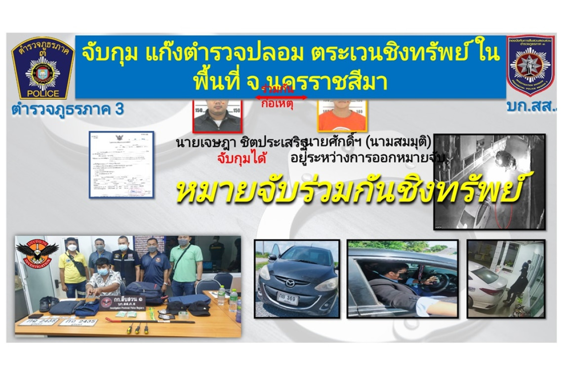 เมื่อเวลา 15.00 น. วันที่ 7 กันยายน ที่กองกำกับการสืบสวนสอบสวนตำรวจภูธรภาค (กก.สส.ภาค) 3 นครราชสีมา พล.ต.ทภาณุรัตน์ หลักบุญ ผบช.ภาค 3 พร้อม พ.ต.อ.ยุทธพงษ์ รอดนวล ผกก.สืบสวน 1 บก.สส.ภาค 3 และเจ้าหน้าที่สืบสวนร่วมแถลงผลการจับกุมนายเจษฎา ชิตประเสริฐ อายุ 31 ปี ผู้ต้องหาตามหมายจับของศาลาจังหวัดสีคิ้ว ที่ 81/2561 ลงวันที่ 27 สิงหาคม 2664 กระทำความผิดฐาน “ร่วมกันชิงทรัพย์ (ลักทรัพย์ โดยใช้กำลังประทุษร้ายหรือขู่เข็ญว่าในทันใดนั้นจะใช้กำลังประทุษร้าย เพื่อให้ความสะดวกแก่การลักทรัพย์นั้นไป) โดยลวงว่าเป็นเจ้าพนักงาน” พร้อมของกลาง ประกอบด้วย 1.รถเก๋ง ยี่ห้อมาสด้า 2 สีเทาดำ ไม่ติดแผ่นป้ายทะเบียน 2.ทะเบียนรถยนต์ กฉ 2435 สุรินทร์ จำนวน 2 แผ่น 3.เสื้อผ้าใช้ก่อเหตุ 4.อาวุธปืนไทยประดิษฐ์ 1 กระบอก โดยกำลังได้วางแผนสะกดรอยจับกุมตัวได้โดยละม่อมเมื่อเวลา 10.00 น. ที่บ้านเลขที่ 110 หมู่ที่ 6 ต.ทุ่งสว่าง อ.ประทาย จ.นครราชสีมา