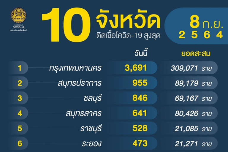 เมื่อวันที่ 8 ก.ย.64 ศูนย์ข้อมูลโควิด-19 รายงานสถานการณ์โรคติดเชื้อไวรัสโควิด-19 ในประเทศไทย ข้อมูล ณ วันที่ 8 ก.ย.64 เวลา 01.00 น. พบผู้ติดเชื้อรายใหม่ในทั้ง 77 จังหวัดของไทย จังหวัดที่พบผู้ติดเชื้อรายใหม่มากที่สุดคือ กทม.โดยตัวเลขยังคงสูงอยู่ 3,691 ราย ตามด้วยสมุทรปราการ ที่ลดลงต่ำกว่าพันแต่ก็ยังคงสูงเช่นกันที่ 955 ชลบุรีมาเป็นอันดับ 3 และสมุทรสาครอันดับ 4 ขณะจังหวัดที่พบผู้ติดเชื้อรายใหม่น้อยที่สุด วันนี้อยู่ในภาคตะวันออกเฉียงเหนือ จ.เลย จำนวน 2 ราย ขณะที่จังหวัดที่พบผู้ติดเชื้อรายใหม่เกินร้อยมี 31 จังหวัด ภาคกลาง ภาคตะวันออกเฉียงเหนือ และภาคตะวันตกลดลง แต่ต้องจับตาภาคใต้ ที่จำนวนผู้ติดเชื้อรายใหม่เพิ่มขึ้น และภาคตะวันออก ที่พบผู้ติดเชื้อรายใหม่เกินร้อยยกทั้งภาค