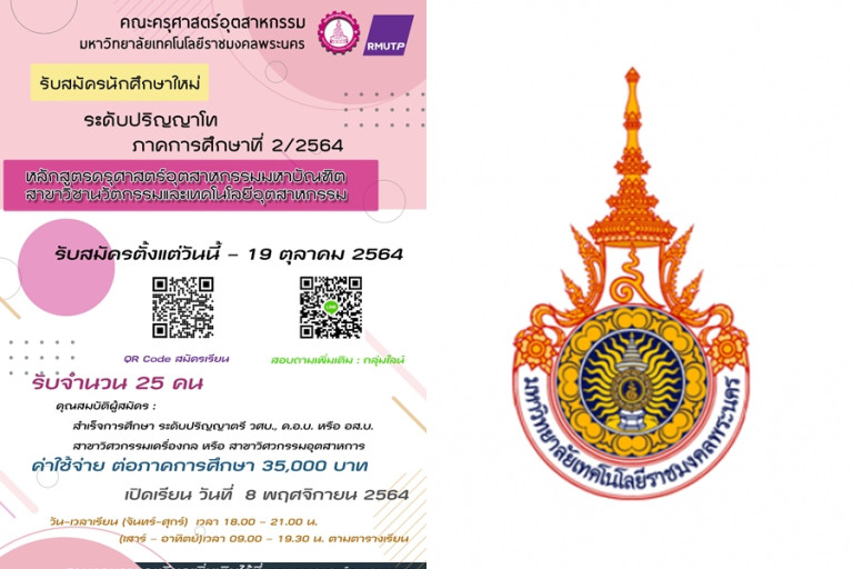 ทั้งนี้คุณสมบัติผู้เข้าศึกษา เป็นผู้สำเร็จการศึกษาระดับปริญญาวิศวกรรมศาสตรบัณฑิต ครุศาสตร์อุตสาหกรรมบัณฑิต และอุตสาหกรรมศาสตรบัณฑิต สาขาวิชาวิศวกรรมเครื่องกล วิศวกรรมยานยนต์ วิศวกรรมเครื่องจักรกล วิศวกรรมอุตสาหการ วิศวกรรมแม่พิมพ์ และเทคโนโลยีบัณฑิต สาขาวิชาเทคโนโลยีเครื่องกล เทคโนโลยีแม่พิมพ์ เทคโนโลยียาง เทคโนโลยีเครื่องกลเรือ และ/หรือคุณวุฒิอื่นที่เทียบเท่า โดยเปิดรับนักศึกษา ในภาคเรียนที่ 2 /2564 จำนวน 25 คน ผู้สนใจเข้าศึกษายื่นใบสมัครได้ตั้งแต่บัดนี้ – 19 ตุลาคม 2564 ดูรายละเอียดเพิ่มเติมที่ https://teched.rmutp.ac.th หรือสอบถามเพิ่มเติมที่ ฝ่ายวิชาการและวิจัย คณะครุศาสตร์อุตสาหกรรม โทร .0-2665-3777 ต่อ 7104 และ 8251