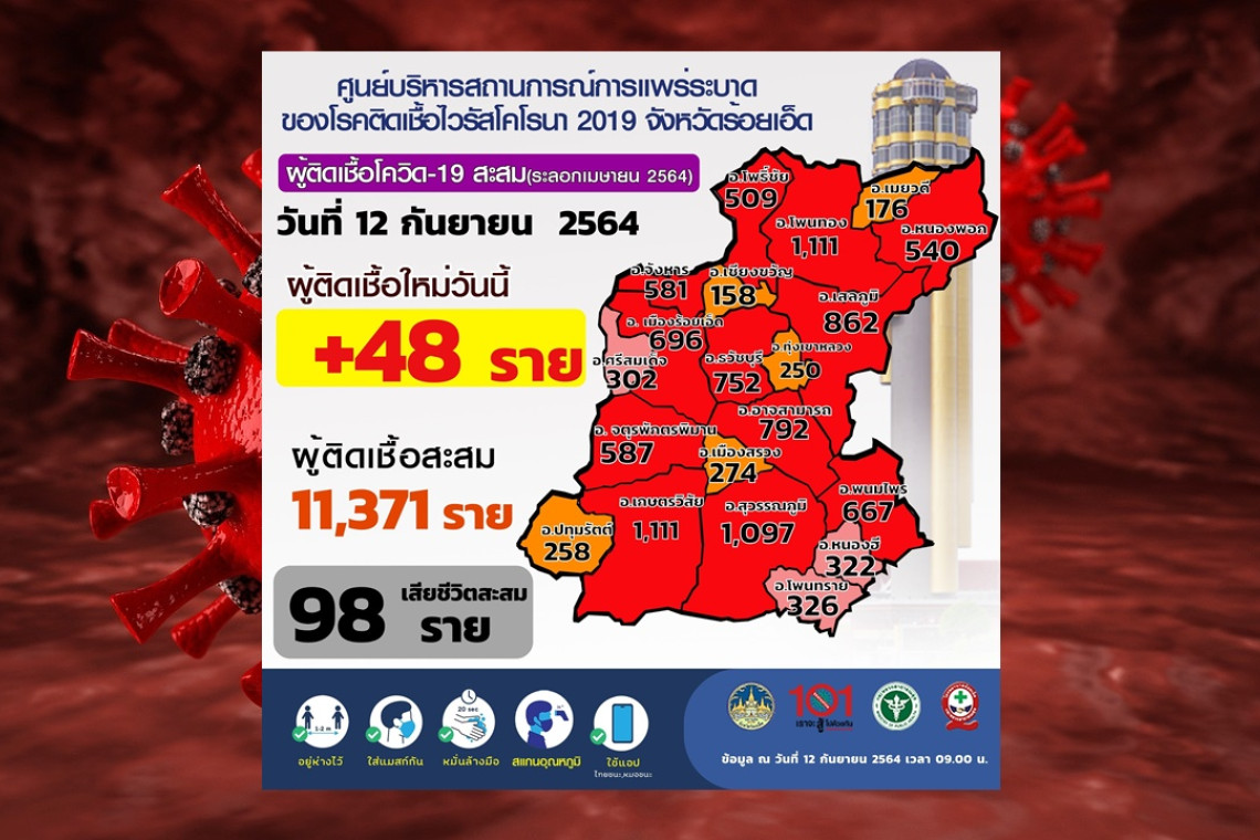 สถานการณ์โรคโควิด-19 จังหวัดร้อยเอ็ด ประจำวันที่ 12 กันยายน 2564 รักษาหายเพิ่ม 62 ราย กำลังรักษาอยู่ 682 ราย เสียชีวิตสะสม 98 ราย พบผู้ติดเชื้อโรคโควิด-19 เพิ่มขึ้น 48 ราย ยอดติดเชื้อสะสมรวม 11,371 ราย ซึ่งผู้ติดเชื้อโควิด19รายใหม่ ที่เดินทางมาจากต่างจังหวัด 38 ราย และเป็นผู้ติดเชื้อภายในจังหวัดร้อยเอ็ด จำนวน 10 ราย (สัมผัสใกล้ชิดกับผู้ป่วยโควิดในครอบครัว/ชุมชน 9 ราย และ ขับรถตู้โดยสาร กรุงเทพฯ - สุวรรณภูมิ 1 ราย) ใน 14 อำเภอ ดังนี้