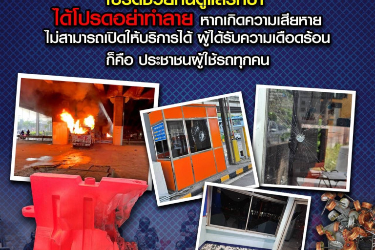 กทพ.จึงขอความกรุณาโปรดอย่าทำลายทรัพย์สินของทางพิเศษ ซึ่งเป็นสมบัติของส่วนรวม หากเกิดความเสียหายไม่สามารถเปิดใช้บริการได้ ผู้ที่ได้รับความเดือดร้อนก็คือประชาชนผู้ใช้รถทุกคน