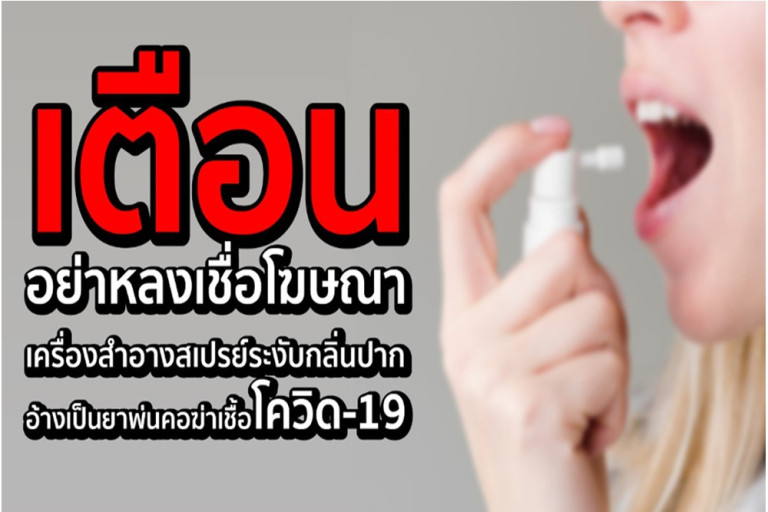 เภสัชกรหญิงสุภัทรา บุญเสริม ผู้ทรงคุณวุฒิด้านมาตรฐานผลิตภัณฑ์ด้านสาธารณสุข และรักษาราชการแทนรองเลขาธิการคณะกรรมการอาหารและยา เปิดเผยว่า สำนักงานคณะกรรมการอาหารและยา (อย.) ตรวจพบการโฆษณาสเปรย์ระงับกลิ่นปากทางสื่อออนไลน์ต่าง ๆโอ้อวดสรรพคุณเป็นยาพ่นคอฆ่าเชื้อโควิด 19 ใช้แล้วเชื้อไม่ลงปอดพร้อมแสดงเลขที่ใบรับจดแจ้งหรืออ้างผ่าน อย. แล้ว จากการตรวจสอบพบว่า ผลิตภัณฑ์ตามที่โฆษณามักมีส่วนผสมของพืชสมุนไพร เช่น ฟ้าทะลายโจร กระชายขาว โดยจดแจ้งไว้เป็นสเปรย์ระงับกลิ่นปาก แต่โฆษณาสรรพคุณเป็นยาใช้พ่นคอฆ่าเชื้อโควิด ซึ่งตามกฎหมายสเปรย์ระงับกลิ่นปากจัดเป็นเครื่องสำอาง ใช้ฉีดพ่นเข้าในช่องปากเพื่อระงับกลิ่นปาก ให้ความรู้สึกหอมสดชื่นเท่านั้น และปริมาณของพืชสมุนไพรที่ให้ใช้ในเครื่องสำอางไม่มีผลในการฆ่าหรือ