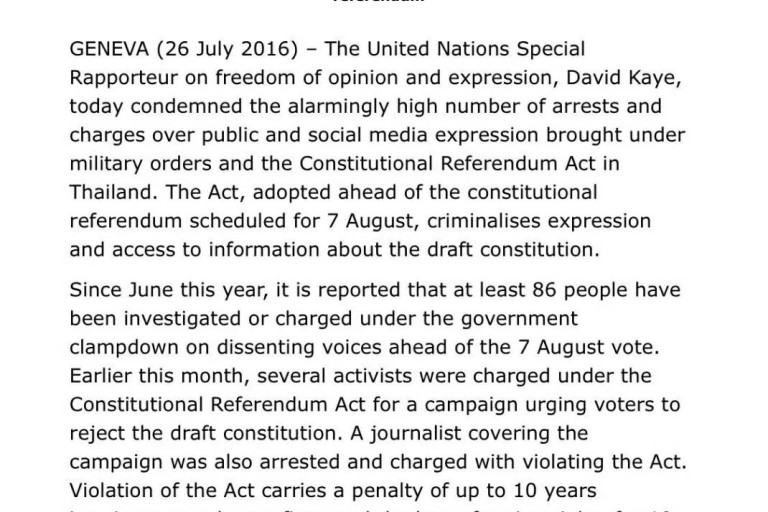 เมื่อวันที่ 26 ก.ค. 59 นายเดวิด คาเย ผู้เสนอรายงานด้านเสรีภาพในการแสดงออกและแสดงความเห็นต่อสหประชาชาติ ได้ออกมาประณามการจับกุม และตั้งข้อหาต่อการแสดงออกในสาธารณะ และการใช้โซเชียลมีเดียภายใต้คำสั่งของรัฐบาลทหารที่มีมากอย่างน่าตกใจ ขณะที่ การลงประชามติ คือการเปิดโอกาสให้มีการอภิปรายกันอย่างเสรี ตามมาด้วยการลงคะแนนของประชาชน โดยเฉพาะอย่างยิ่งเป็นเรื่องที่เป็นที่สนใจ และความคิดที่หลากหลายควรได้รับการส่งเสริมให้แสดงออกอย่างอิสระ