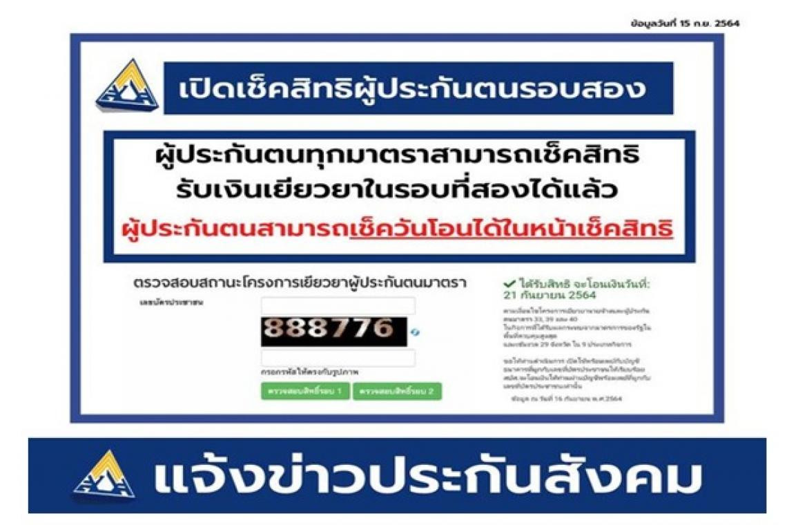 ผู้สื่อข่าวรายงาน ว่า ประชาชนสามารถเข้าไปเช็กสิทธิประกันสังคมมาตรา 33 ที่ www.sso.go.th เพื่ออัปเดตวันโอนเงินเยียวยารอบ 2 จำนวน 2,500 บาท ตั้งแต่วันที่ 16 กันยายน ที่ผ่านมา สำหรับผู้ประกันตนมาตรา 33 ในพื้นที่สีแดงเข้ม 13 จังหวัด ใน 9 ประเภทกิจการ โดยผู้ประกันตนมาตรา 33 ที่เคยได้รับสิทธิเยียวยาประกันสังคมจำนวน 2,500 บาท ในรอบแรกไปแล้วเมื่อช่วงต้นเดือนสิงหาคม ที่ผ่านมา สามารถเข้าไปตรวจสอบสิทธิที่เว็บไซต์ www.sso.go.th ของสำนักงานประกันสังคมได้ เพื่อดูว่าจะได้รับเงินโอนเข้าพร้อมเพย์ในวันที่เท่าไหร่ ซึ่งวิธีตรวจสอบสิทธิประกันสังคมมาตรา 33 มีดังนี้ 1.เข้าเว็บไซต์ www.sso.go.th เลือก ตรวจสอบสิทธิโครงการเยียวยาฯ (ผู้ประกันตนมาตรา 33) 2.เลือกตรวจสอบสถานะโครงการเยียวยาผู้ประกันตนมาตรา 33 3.กรอกเลขบัตรประชาชน 13 หลัก และรหัสตามรูปที่กำหนด 4.กดตรวจสอบสิทธิ์รอบ 2 ระบบจะแสดงผลการค้นหา พร้อมระบุจะอัปเดตข้อมูลล่าสุดตามวันเวลาที่กำหนดอีกครั้ง