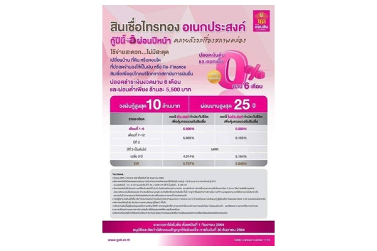 “ออมสิน” ออกสินเชื่อไทรทองอเนกประสงค์ ให้กู้เสริมสภาพคล่อง /ปิดบัญชีหนี้ดอกเบี้ยแพง ผ่อน 0% 6 เดือนใช้บ้าน ที่ดิน ที่สวนไร่นา หรือคอนโด ค้ำประกัน ช่วยแบ่งเบาภาระค่าใช้จ่ายช่วงโควิด