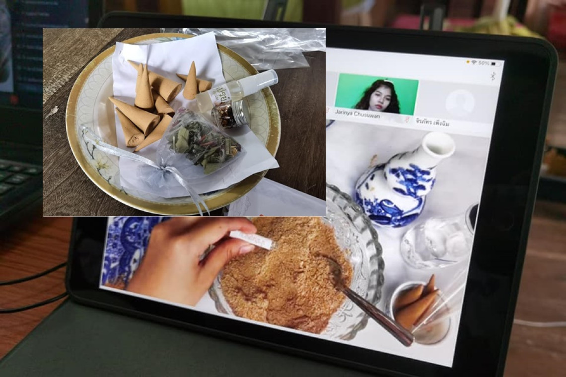 จึงเป็นที่มาของการผลิตเครื่องหอม ภายใต้ชื่องาน “กลิ่นผกา เสน่หาเครื่องหอมไทย” และด้วยข้อจำกัดของสถานการณ์การแพร่ระบาดของโรคโควิด 19 จึงมีการปรับเปลี่ยนรูปแบบการนำเสนอจากการลงพื้นที่จริงสู่รูปแบบออนไลน์ พร้อมมีการจัดส่ง Gift Box ซึ่งภายในมีวัตถุดิบและวิธีการทำพร้อมบรรจุลงในกล่องเพื่อส่งมอบเป็นของขวัญให้กับผู้เข้าร่วมโครงการได้ทดลองปฏิบัติจริงจากที่บ้าน