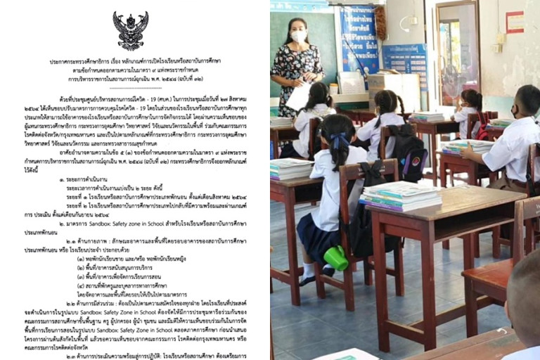 เฟสแรก รร.กินนอน เฟสสอง ไปกลับ ระบุการจะเปิดได้ต้องผ่านเกณฑ์ประเมินหลายด้าน ต้องฉีดวัคซีนไม่น้อยว่า 85% จะจัดเรียนปกติ หรือออนไลน์ หรือผสมผสานได้ กำหนดไม่เกินห้องละ 25 คน พร้อมเว้นระยะห่างอย่างน้อย 1.5 เมตร นายสุภัทร จำปาทอง ปลัดกระทรวงศึกษาธิการ ลงนามประกาศกระทรวงศึกษาธิการ ลงวันที่ 20 กันยายน 2564 เรื่อง หลักเกณฑ์การเปิดโรงเรียนหรือสถาบันการศึกษา ตามข้อกำหนดออกตามความในมาตรา 9 แห่งพระราชกำหนดการบริหารราชการในสถานการณ์ฉุกเฉิน พ.ศ.2548 (ฉบับที่ 32) เพื่อให้ทุกหน่วยงานในสังกัดกระทรวงศึกษาธิการ ใช้ประกอบในการพิจารณาการขออนุญาตใช้อาคารหรือสถานที่ของโรงเรียน และสถาบันการศึกษาในการจัดการเรียนการสอน การสอน การฝึกอบรม หรือทำกิจกรรมใด ๆ ที่มีผู้เข้าร่วมกิจกรรมเป็นจำนวนมาก ทั้งนี้ ได้กำหนดให้มีระยะเวลาดำเนินงาน 2 ระยะ คือ ระยะแรก สำหรับโรงเรียนพักนอน ซึ่งดำเนินการตามโครงการ Sandbox: Safety zone in School มาตั้งแต่ช่วงเดือนสิงหาคม 2564 และระยะที่สอง สำหรับโรงเรียนประเภทไป-กลับ ที่มีความพร้อมและผ่านเกณฑ์การประะเมิน ตั้งแต่เดือนกันยายน 2564 ซึ่งการจะเปิดโรงเรียนได้ ต้องผ่านเกณฑ์การประเมินหลายด้าน เช่น ด้านกายภาพ ด้านการมีส่วนร่วม ด้านการประเมินความพร้อมสู่การปฏิบัติ สำหรับสถานศึกษา ครู-บุคลากรต้องฉีดวัคซีนครบโดสไม่น้อยกว่า 85% ในขณะที่นักเรียน-ผู้ปกครอง ควรได้รับวัคซีนตามมาตรการที่กระทรวงศึกษาธิการและกระทรวงสาธารณสุขกำหนด ทั้งนี้ ในระหว่างการเปิดภาคเรียนไปแล้ว ต้องปฏิบัติตามมาตรการต่าง ๆ อย่างเคร่งครัด และสามารถจัดการเรียนการสอนแบบ Onsite หรือ Online หรือแบบผสมผสาน (Hybrid) ก็ได้ โดยแต่ละห้องเรียนไม่เกิน 25 คน เว้นระยะห่างไม่น้อยกว่า 1.5 เมตร