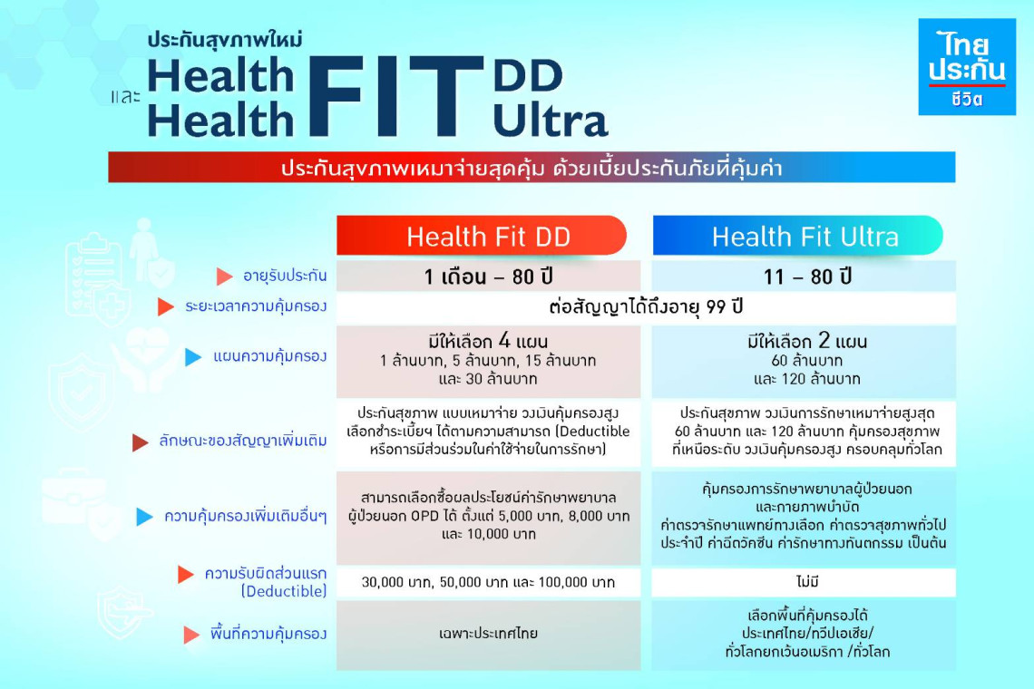 ไทยประกันชีวิตจึงได้พัฒนาสัญญาเพิ่มเติมประกันสุขภาพแบบเหมาจ่าย 2 แบบ ประกอบด้วย สัญญาเพิ่มเติม ประกันสุขภาพ Health Fit DD เหมาะสำหรับกลุ่มคนวัยทำงาน หรือผู้ที่มีสวัสดิการค่ารักษาพยาบาลอยู่แล้ว แต่ต้องการทำประกันสุขภาพเพิ่ม เพื่อยกระดับคุณภาพการรักษาและวงเงินความคุ้มครองสูงขึ้น ด้วยเบี้ยประกันภัยที่คุ้มค่า โดยมีแผนประกันให้เลือก 4 แผน ตั้งแต่ 1 ล้านบาท, 5 ล้านบาท, 15 ล้านบาท และสูงสุด 30 ล้านบาท ซึ่งให้ความคุ้มครองทั้งกรณีผู้ป่วยใน (IPD) และผู้ป่วยนอก (OPD)