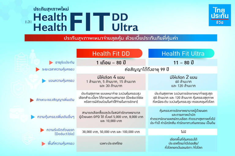 ไทยประกันชีวิต ส่งประกันสุขภาพเหมาจ่ายสุดคุ้ม “Health Fit DD” และ “Health Fit Ultra” วงเงินความคุ้มครองสูง ให้ความคุ้มครองครอบคลุมทั้งผู้ป่วยนอกและผู้ป่วยในแบบครบครัน และคุ้มครองยาวนานจนถึงอายุ 99 ปี ตอบโจทย์การสร้างหลักประกันด้านสุขภาพให้กับคนไทย