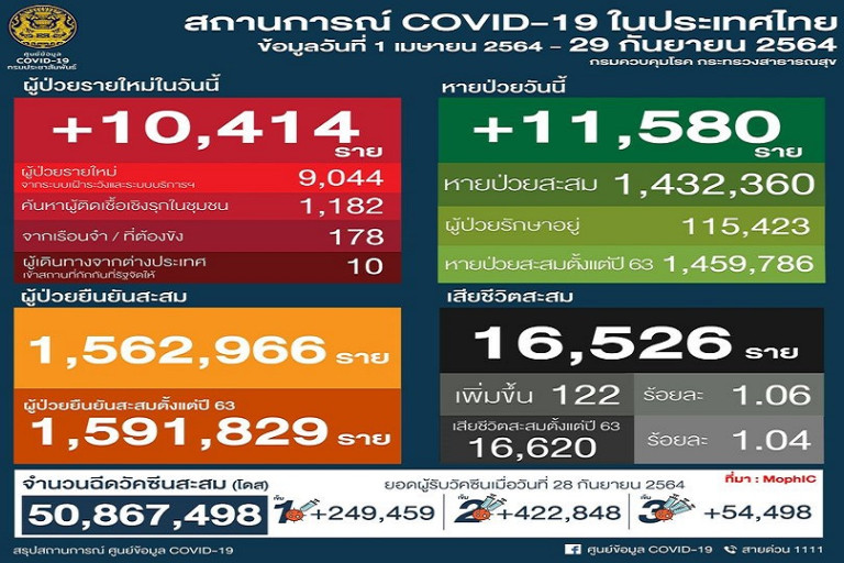 เมื่อวันที่ 29 ก.ย.64 ศูนย์ข้อมูลโควิด-19 รายงานสถานการณ์โรคติดเชื้อไวรัสโควิด-19 ในประเทศไทย พบผู้ติดเชื้อรายใหม่ 10,414 ราย รวมยอดผู้ป่วยสะสม 1,591,829 ราย โดยเป็นการติดเชื้อในประเทศ 10,404 ราย (เรือนจำ 178 ราย) และเดินทางมาจากต่างประเทศ 10 ราย รวมยอดติดเชื้อสะสม 1,591,829 ราย เสียชีวิตเพิ่มอีก 122 ราย รวมยอดเสียชีวิตสะสม 16,620 ราย รักษาหายเพิ่มอีก 11,590 ราย รวมยอดรักษาหายสะสม 1,459,786 ราย กำลังรักษาตัว 115,423 ราย โดยอยู่ในโรงพยาบาล 35,628 ราย อยู่ในโรงพยาบาลสนามและอื่นๆ 79,795 ราย ผู้ป่วยอาการหนัก 3,232 ราย ในจำนวนนี้ต้องใส่เครื่องช่วยหายใจ 729 ราย (ขณะมีรายงานการตรวจพบเชื้อด้วยการตรวจ ATK 5,100 ราย แต่ทางศบค.ไม่นับรวมกับยอดติดเชื้อ)