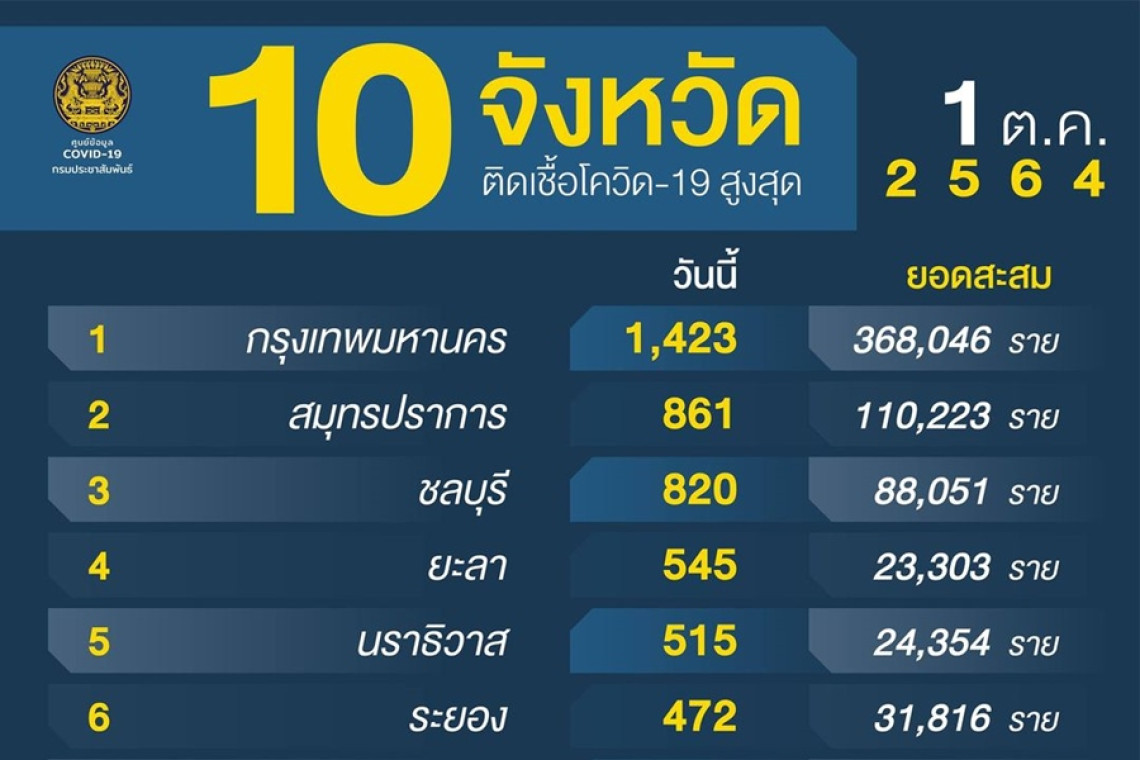 ชัยนาท-อำนาจเจริญ รอดนอกนั้นยังติดหมด 32 จว.ยังติดเชื้อเกินร้อย กทม.ลดลงรายวันแต่ยังสูงสุด ขณะภาคใต้น่าห่วงตัวเลขพุ่ง ตะวันออกเกินร้อยทุกจังหวัด เมื่อวันที่ 1 ต.ค.64 ศูนย์ข้อมูลโควิด-19 ได้รายงานสถานการณ์โรคติดเชื้อไวรัสโควิด-19 ในประเทศไทย ข้อมูล ณ วันที่ 1 ต.ค.64 เวลา 01.00 น. ประเทศไทยยังพบผู้ติดเชื้อรายใหม่ใน 75 จังหวัด โดยมีเพียง 2 จังหวัดที่ไม่พบผู้ติดเชื้อรายใหม่ คือ ชัยนาท และอำนาจเจริญ ขณะที่กทม.พบผู้ติดเชื้อลดลงจากเมื่อวาน แต่ยังคงสูงที่สุดในประเทศ ที่ 1,423 ราย ตามด้วยสมุทรปราการ ชลบุรี ขณะที่พบว่าสถานการณ์ภาคใต้ยังน่าเป็นห่วง โดยมีจังหวัดจากภาคใต้ติด 10 อันดับติดเชื้อสูงสุดถึง 5 จังหวัดคือ ยะลา นราธิวาส สงขลา ปัตตานี และนครศรีธรรมราช ทั้งนี้ พบมีผู้ติดเชื้อรายใหม่เกินร้อยจำนวน 32 จังหวัด มากที่สุดคือ ภาคใต้ ตามด้วย ภาคกลาง ภาคตะวันออก ขณะที่ภาคตะวันตก พบผู้ติดเชื้อรายใหม่เกินร้อยยกทั้งภาค 5 จังหวัด ภาคใต้ พบผู้ติดเชื้อรายใหม่เกินร้อยใน 10 จังหวัดคือ ยะลา นราธิวาส สงขลา ปัตตานี นครศรีธรรมราช ภูเก็ต สุราษฎร์ธานี ชุมพร พัทลุง และกระบี่ ภาคกลาง พบผู้ติดเชื้อรายใหม่เกินร้อยใน 8 จังหวัดคือ กทม. สมุทรปราการ สมุทรสาคร นนทบุรี สระบุรี พระนครศรีอยุธยา ปทุมธานี และนครสวรรค์ ภาคตะวันออก พบผู้ติดเชื้อใหม่เกินร้อยใน 5 จังหวัดคือ ชลบุรี ระยอง ปราจีนบุรี จันทบุรี และฉะเชิงเทรา ภาคตะวันตก พบติดเชื้อใหม่เกินร้อยยกทั้งภาค ครบ 5 จังหวัด ตาก ราชบุรี กาญจนบุรี เพชรบุรี และประจวบคีรีขันธ์ ภาคตะวันออกเฉียงเหนือ พบติดเชื้อใหม่เกินร้อยใน 4 จังหวัดคือ นครราชสีมา ขอนแก่น อุดรธานี และอุบลราชธานี ส่วนภาคเหนือ ยังคงไม่พบติดเชื้อใหม่เกินร้อย โดยมีเพียงจ.เชียงใหม่ ที่พบติดเชื้อสูงสุดที่ 64 ราย